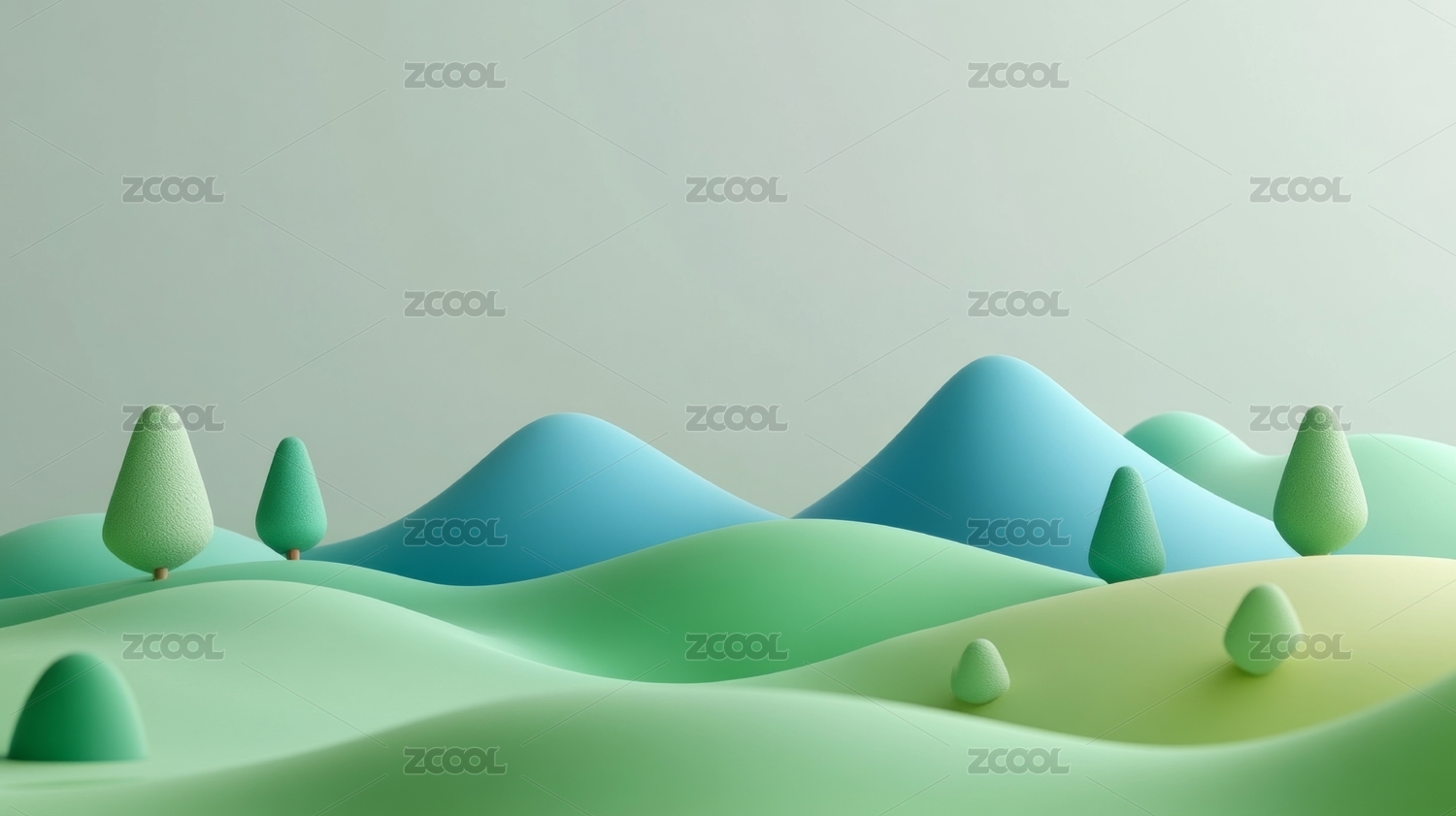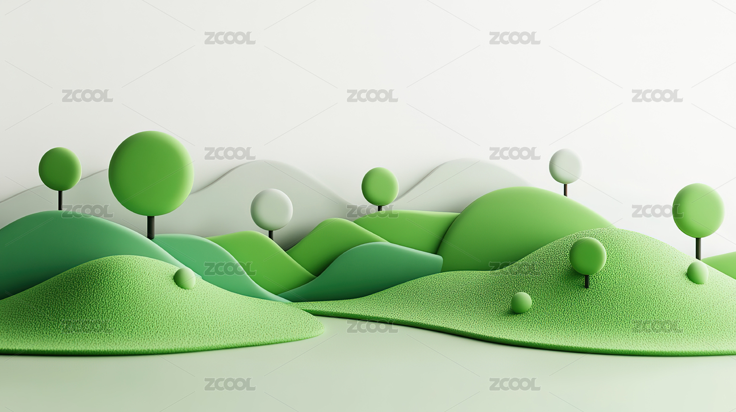 绿色丘陵与树木构成的抽象风景,清新简约