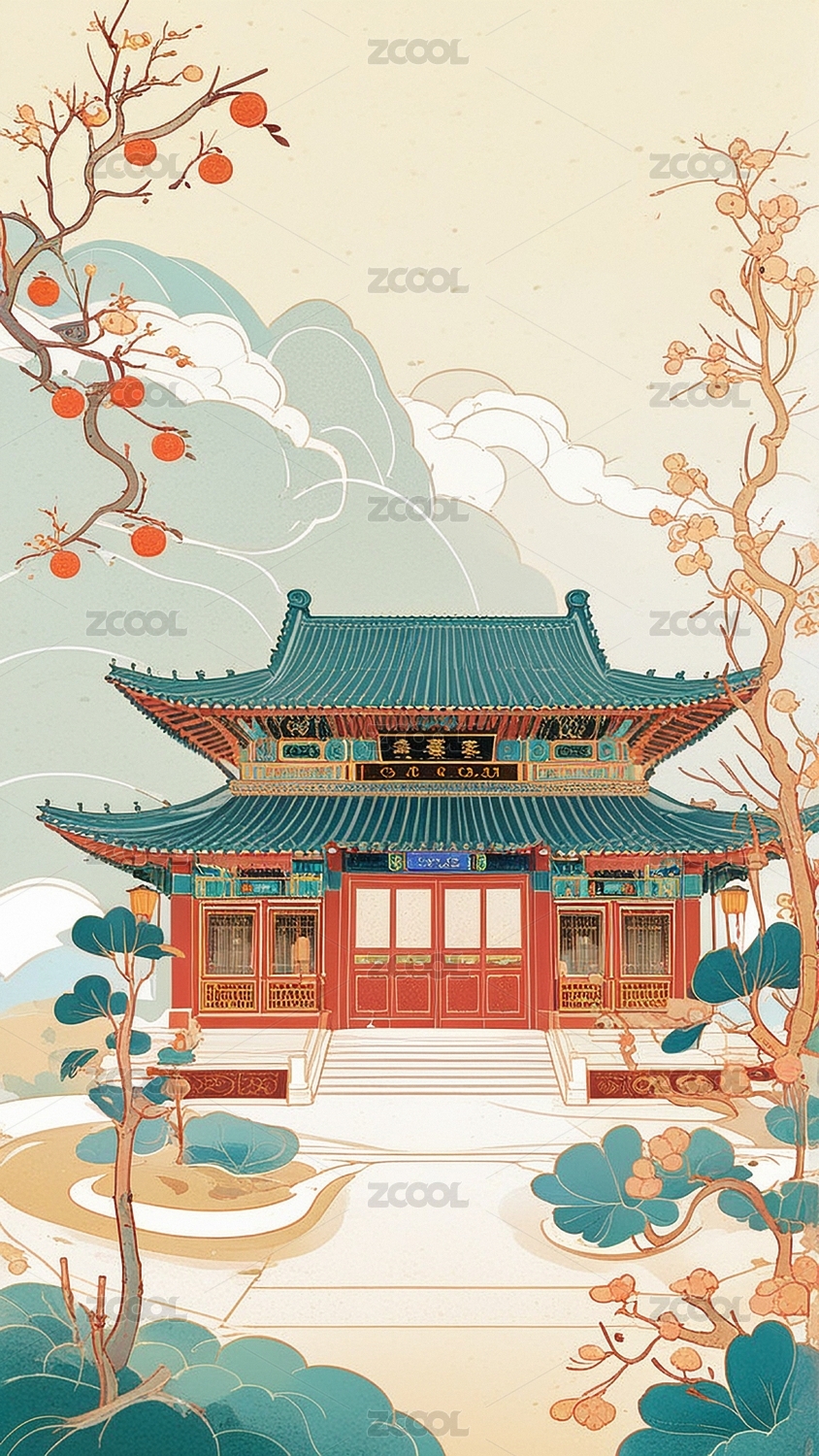 国潮风,古风,国风,古建筑,中式,建筑,插画,背景,壁纸,素材
