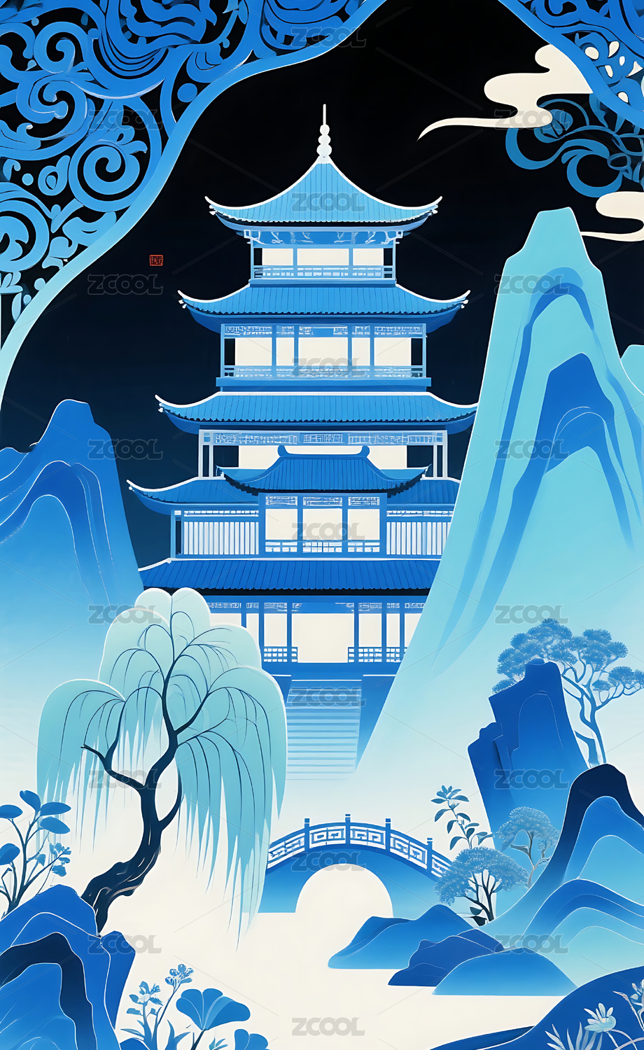 蓝色中式阁楼插画背景