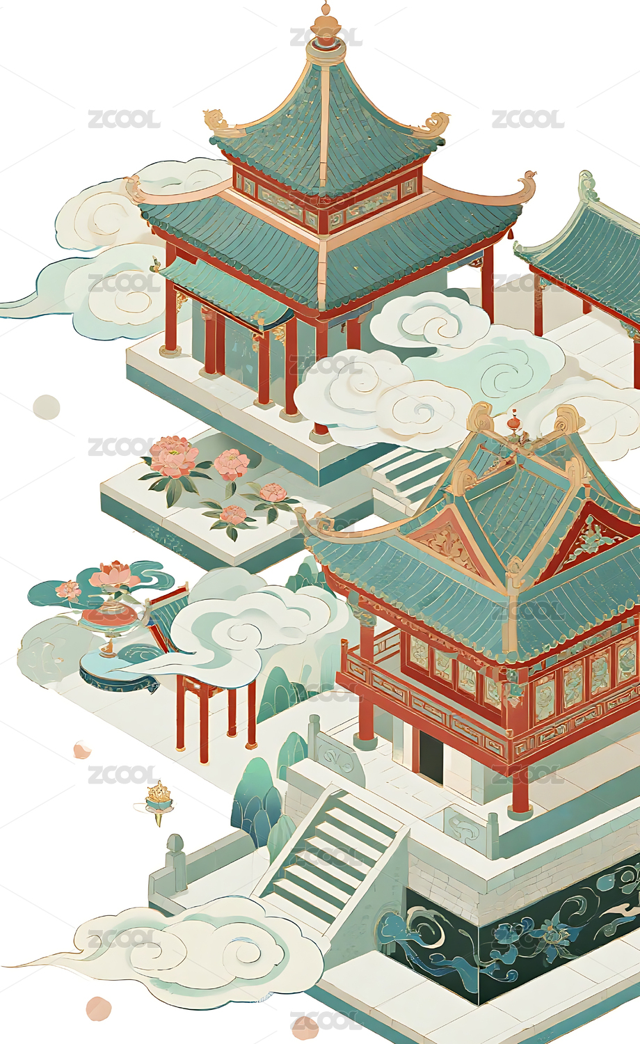 亭台楼阁绿树祥云风景