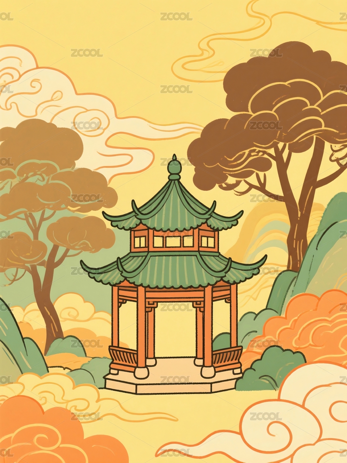 颜色鲜明的工笔画风格中式建筑国风山水插画