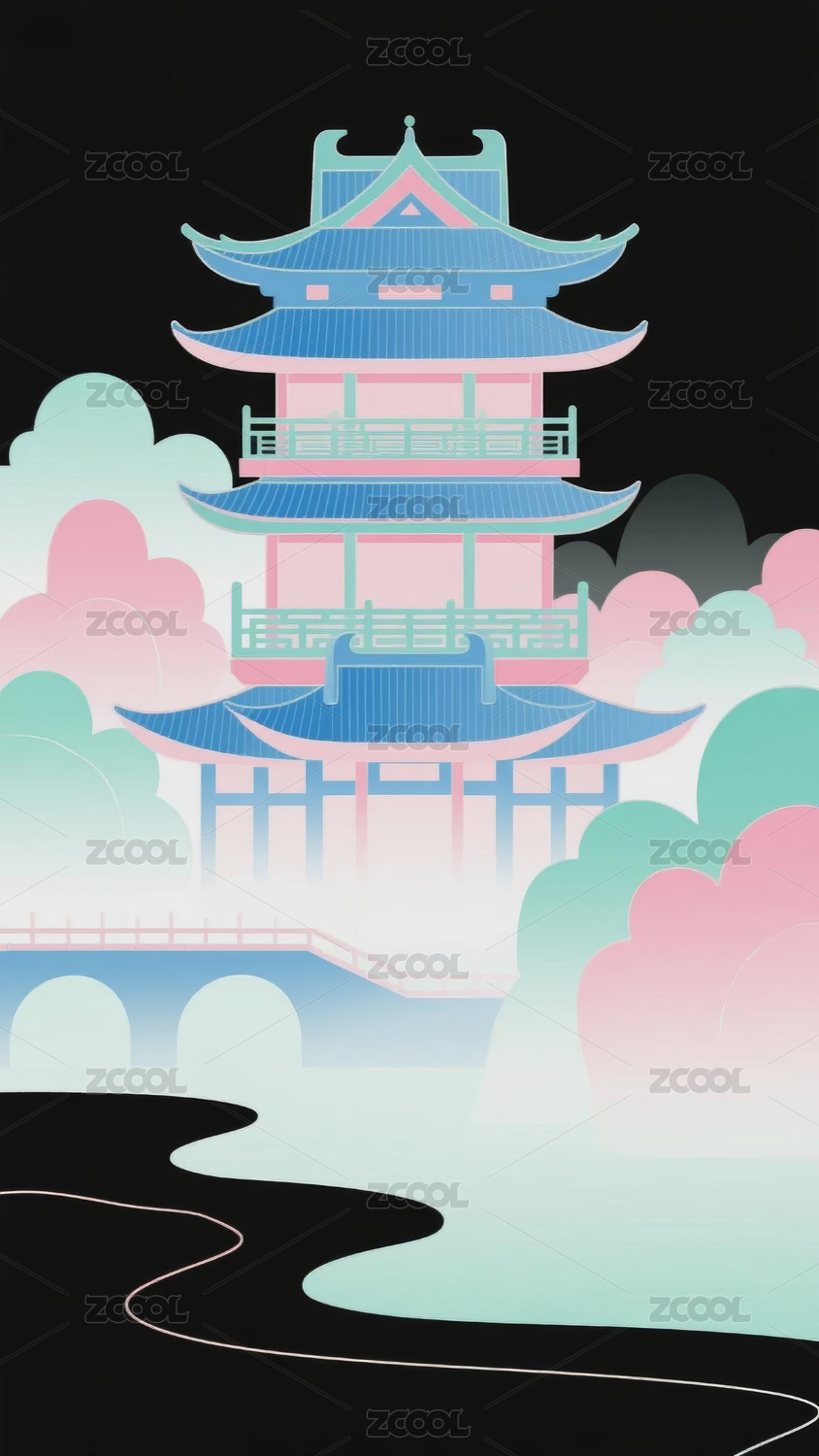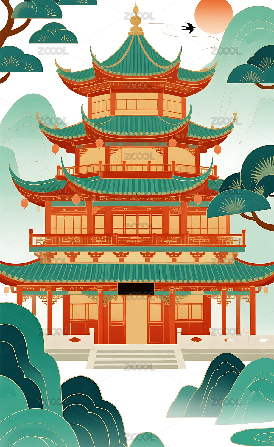 中式古建筑亭台楼阁插画