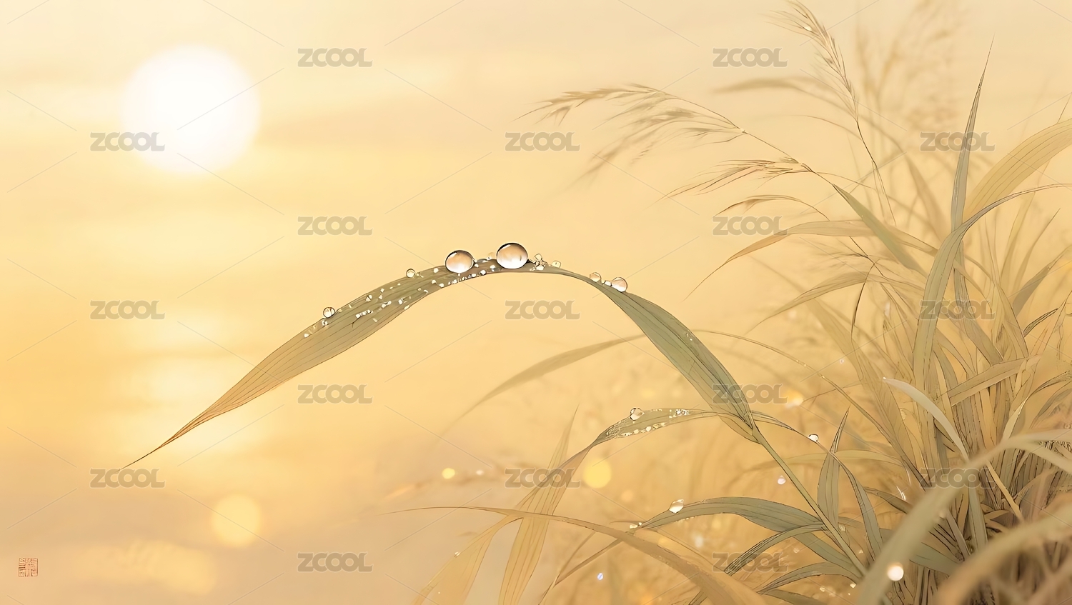 黄昏,草叶,露珠,光影,静谧,自然,诗意,暖黄,柔和,风景