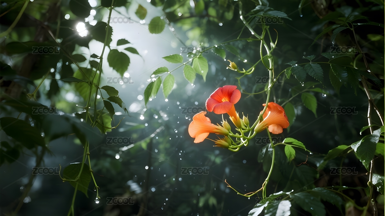 凌霄花,雨珠,橙花,翠蔓,绿叶,水滴,花苞,垂枝,清新,湿润