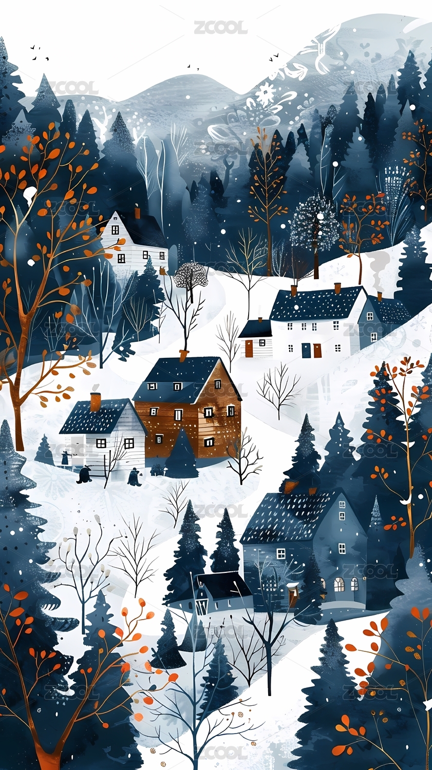 蓝白色乡村小镇风景油画抽象海报背景装饰画