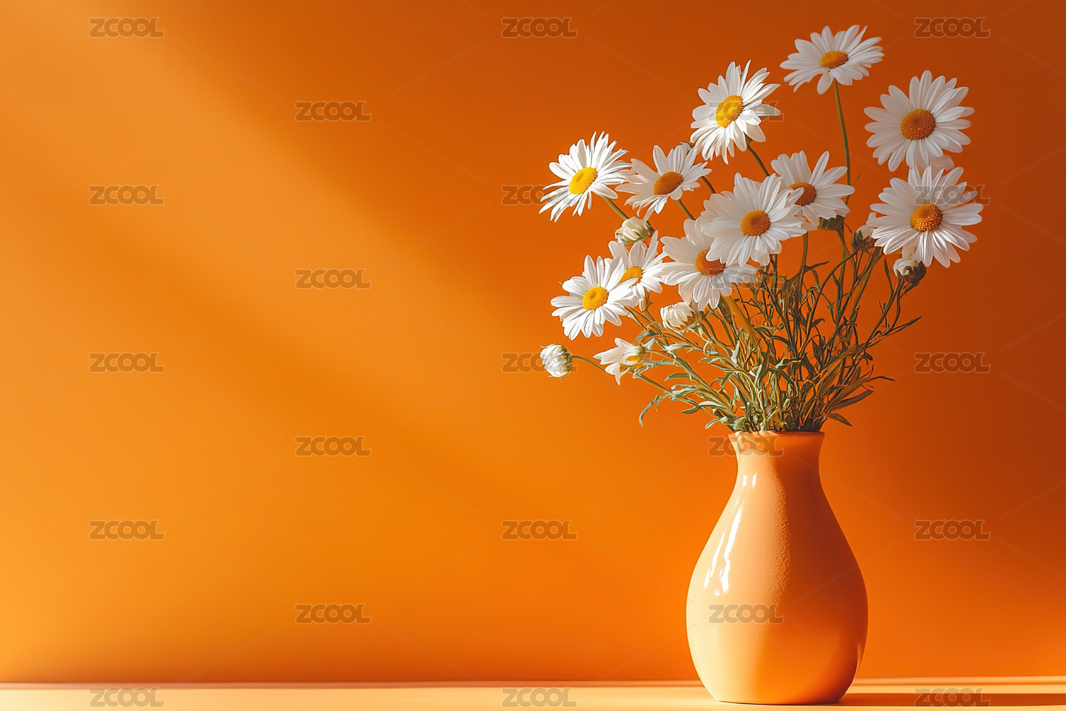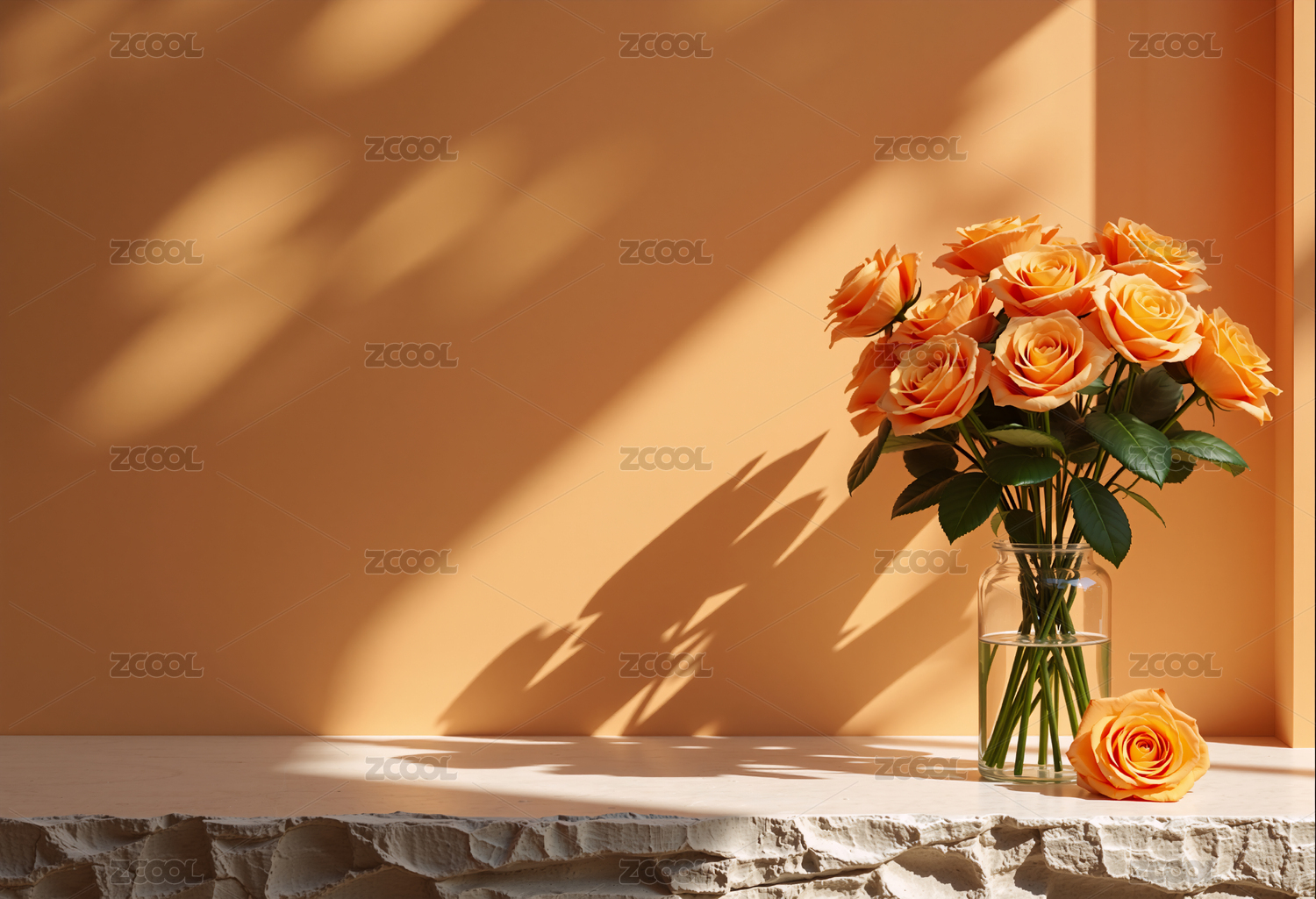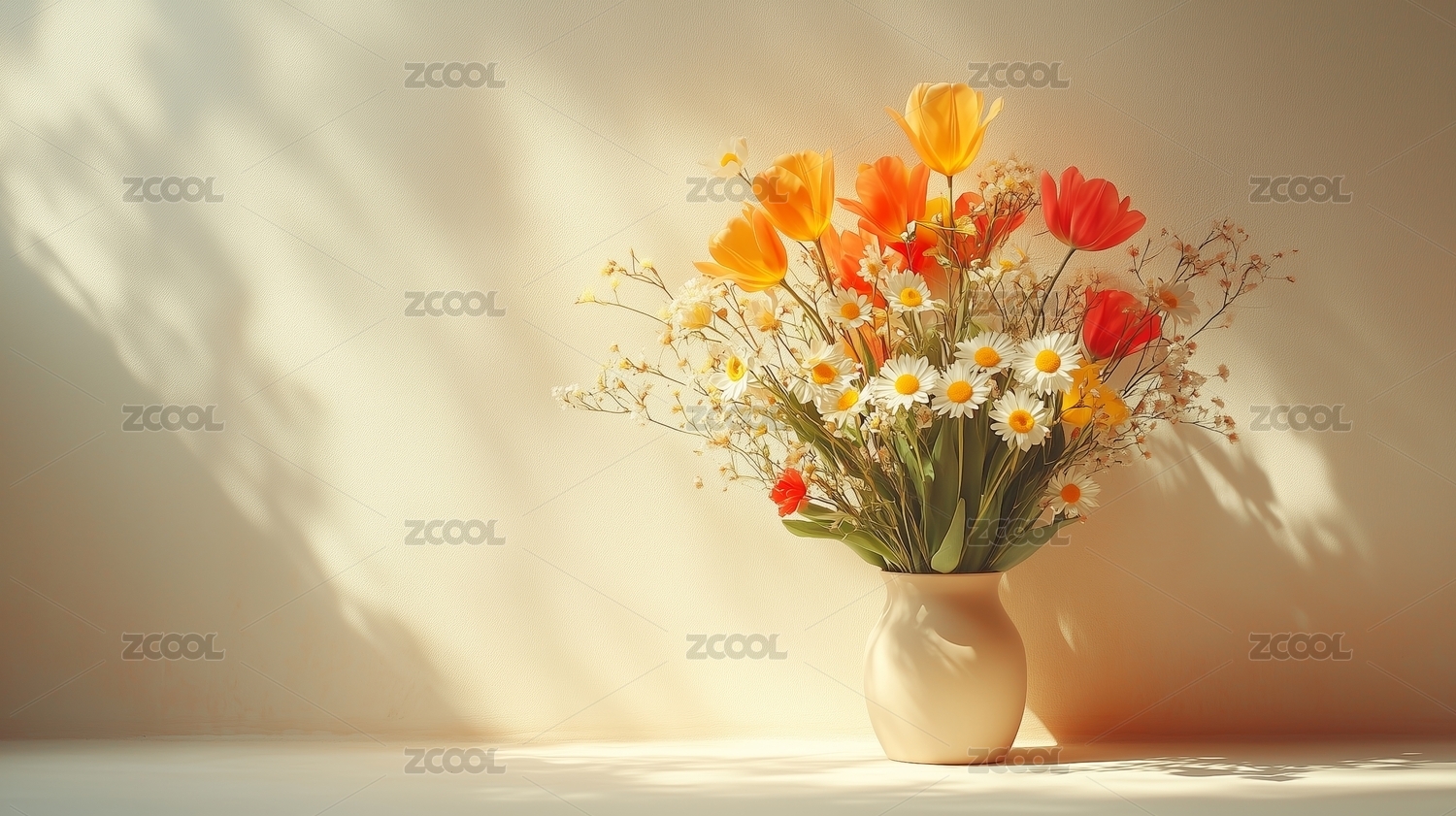 花束,阳光,黄色墙壁,木桌,玻璃花瓶,红色花朵,橙色花朵,白色花朵,绿叶,影子