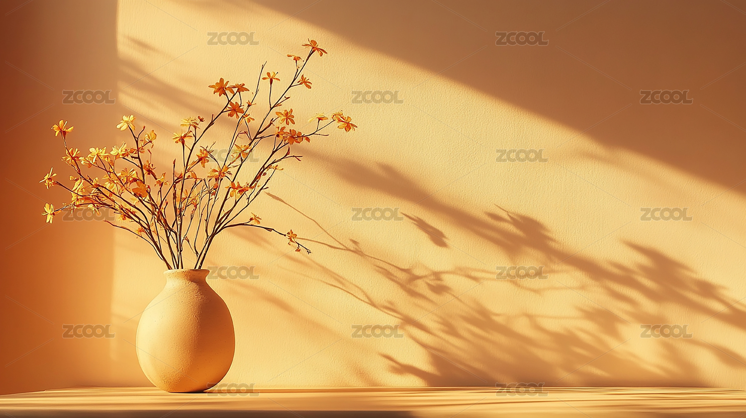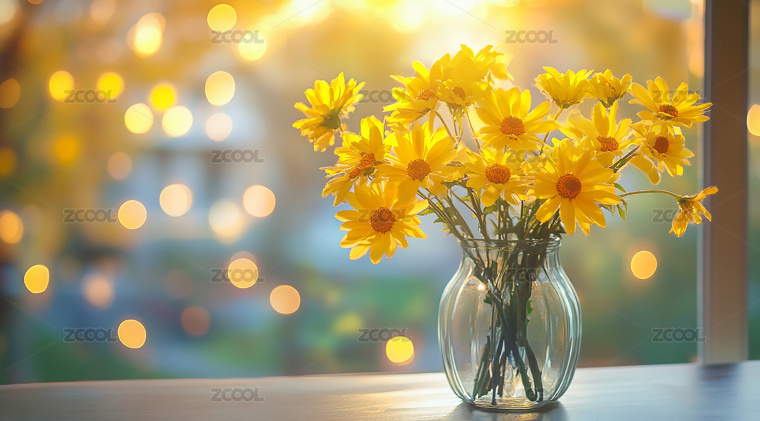 秋季深秋阳台上摆放着玻璃瓶里的金色花朵