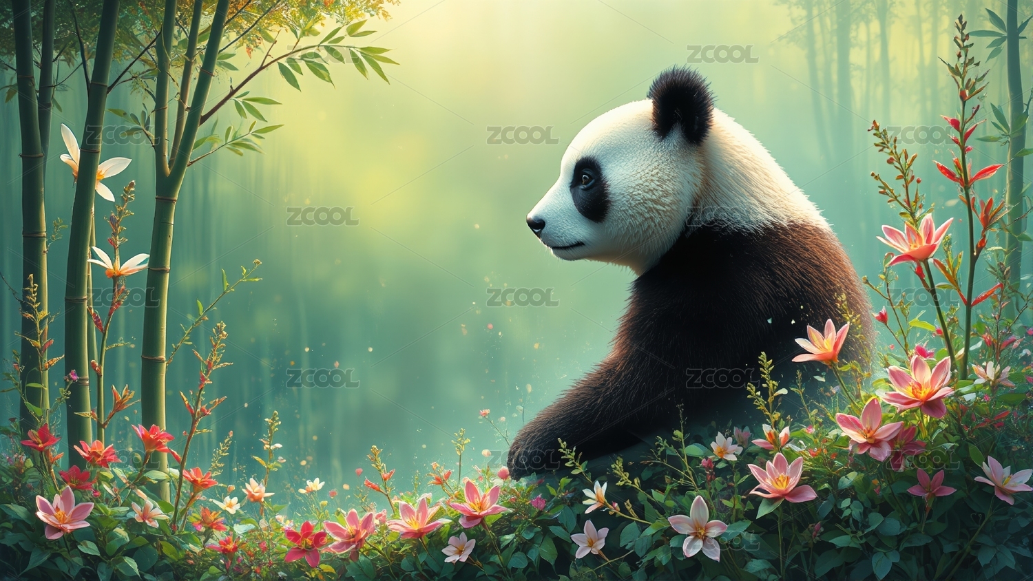 大熊猫,森林,阳光,花朵,草地,竹子,休息,自然,美丽,动物