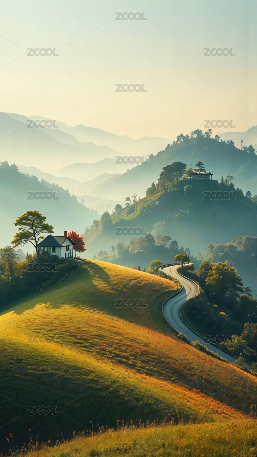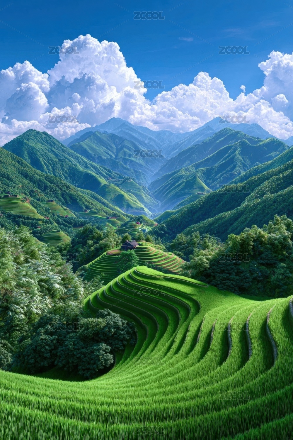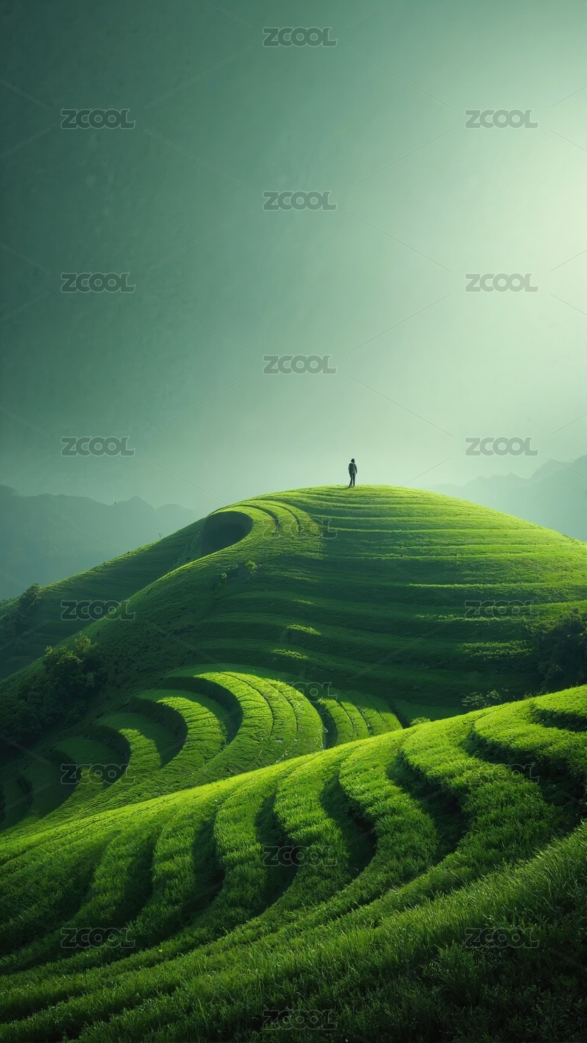 梯田,山峦,云雾,树木,绿色,景观,自然,清晨,山谷,远山