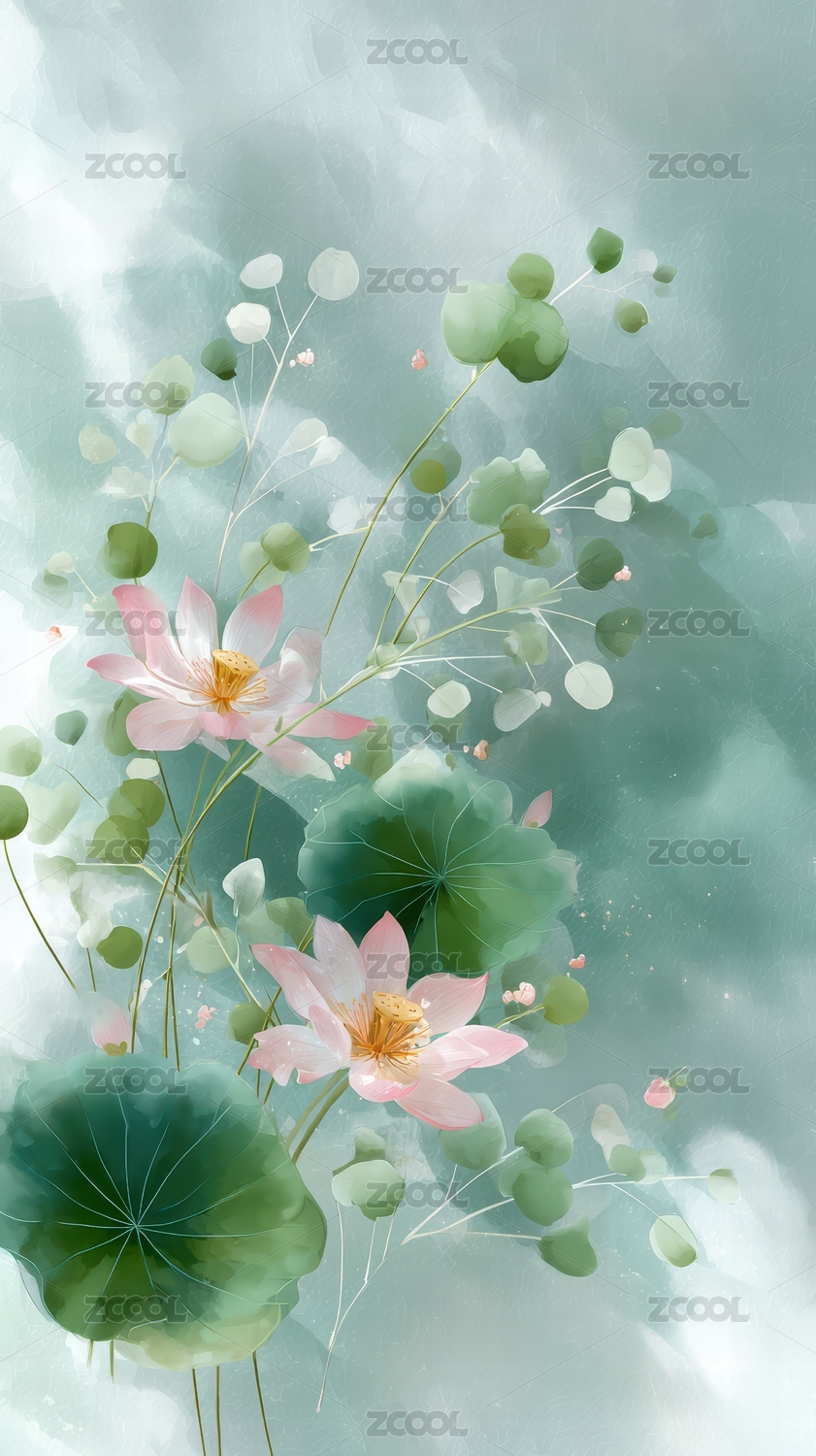 背景,绿叶,花瓣,清新,水彩,淡雅,荷花,花蕾