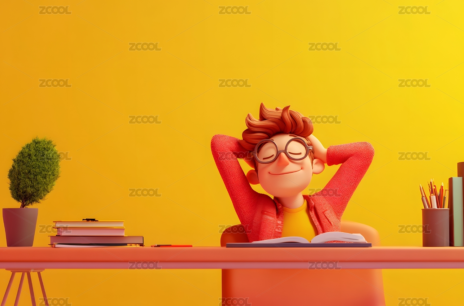 翘二郎坐使用电脑双手抱头的男青年3D插画