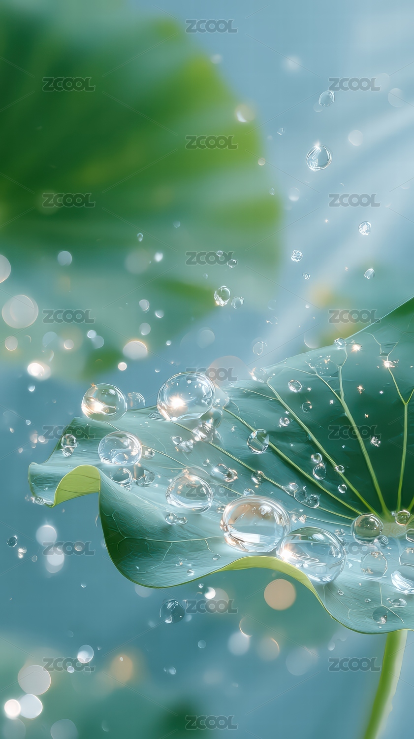晶莹露珠点缀翠绿荷叶的静谧美景