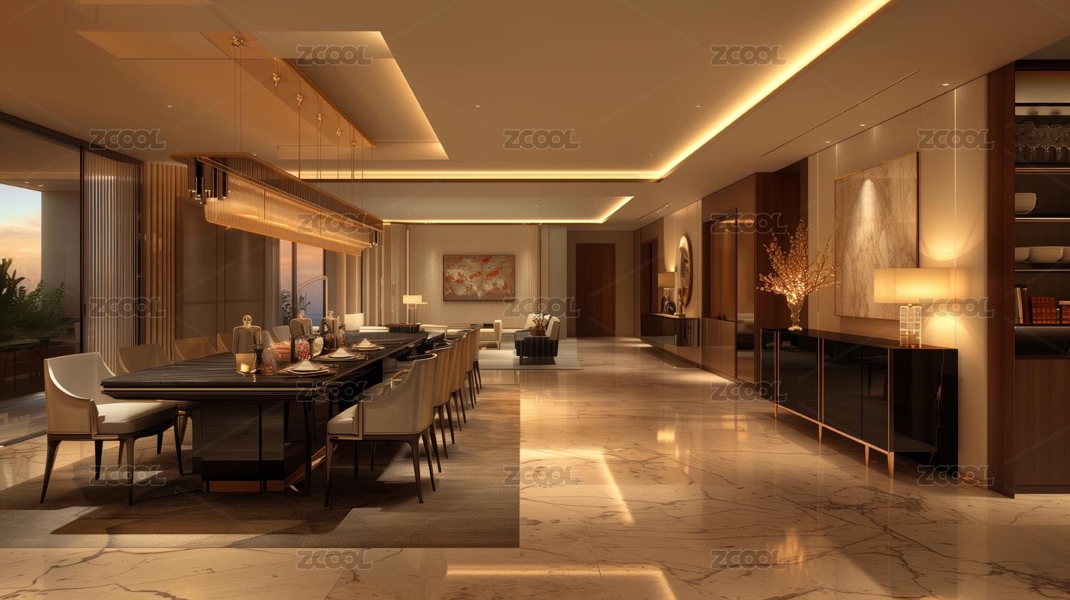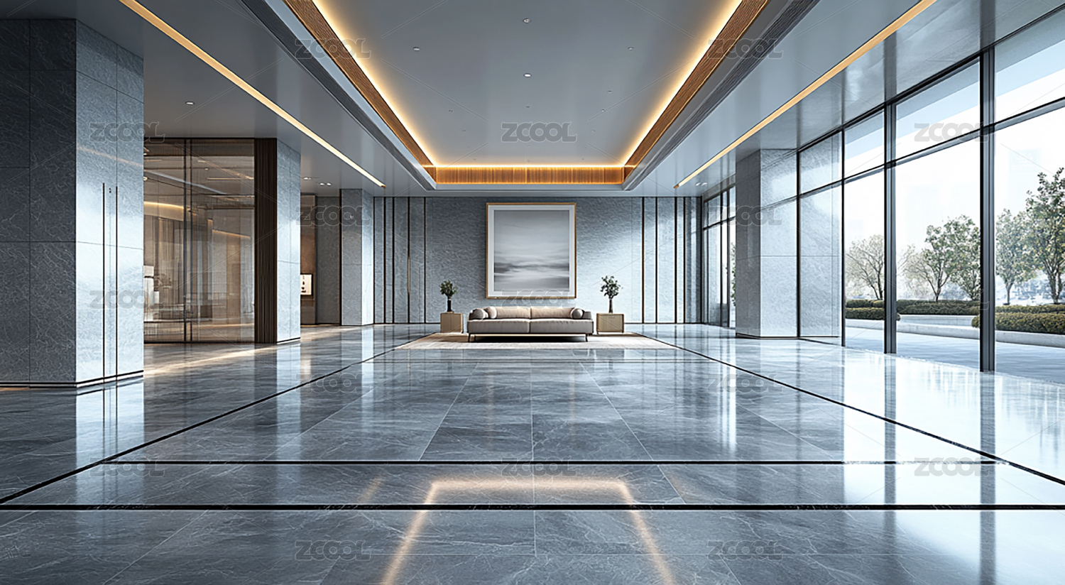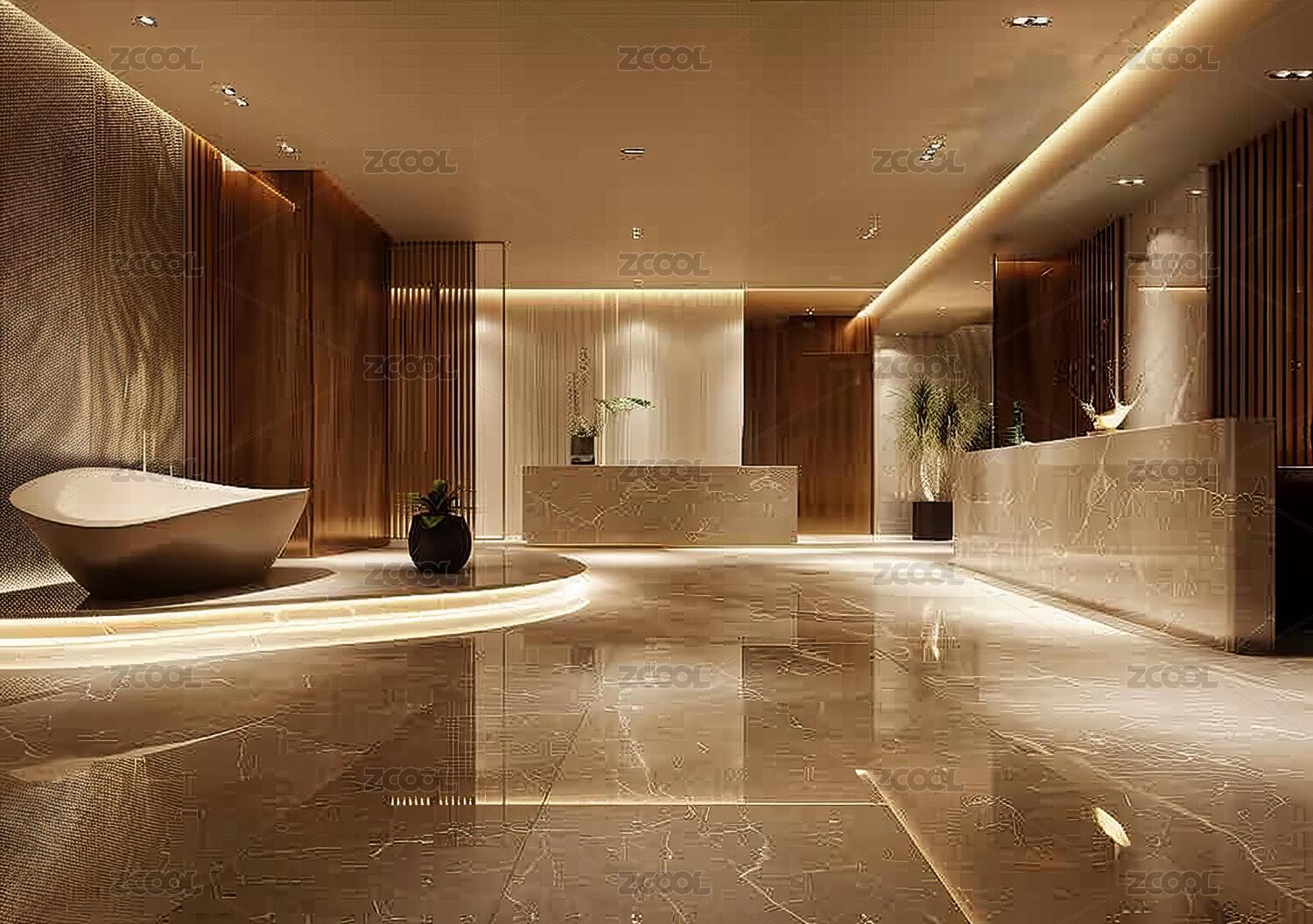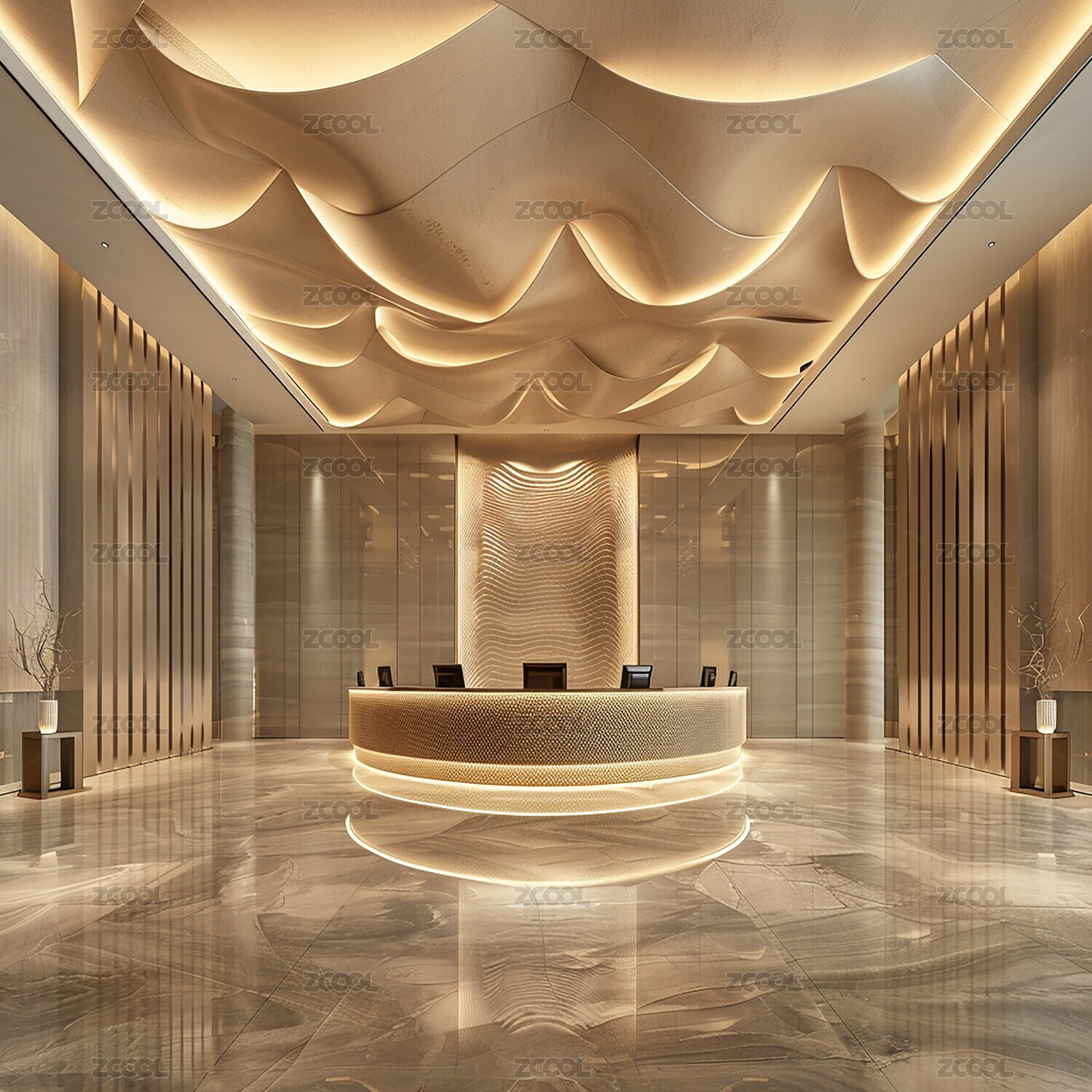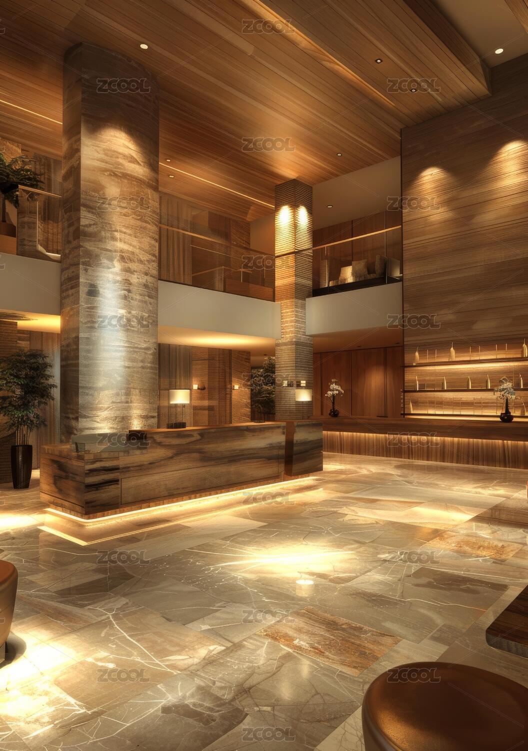 大理石墙和吊灯的现代豪华酒店大堂内部设计