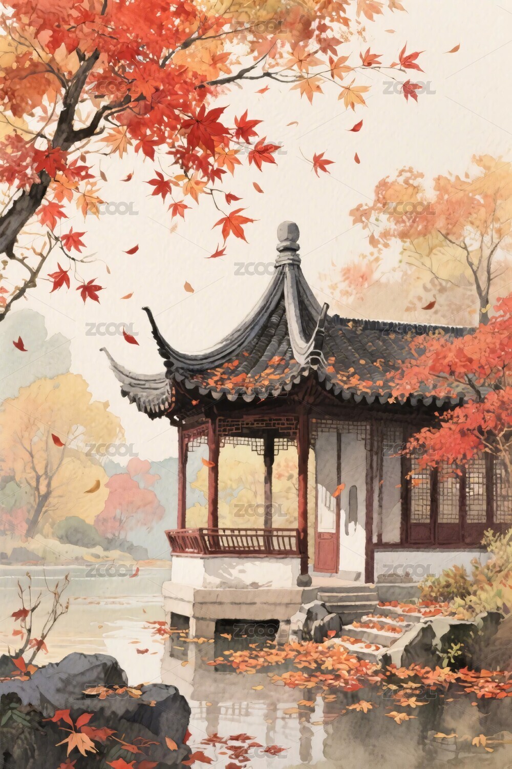 秋天中国风绘画插画建筑场景风景