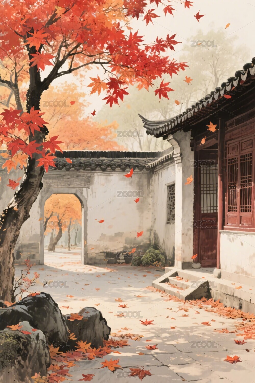秋天写意中国风房子和红叶风景