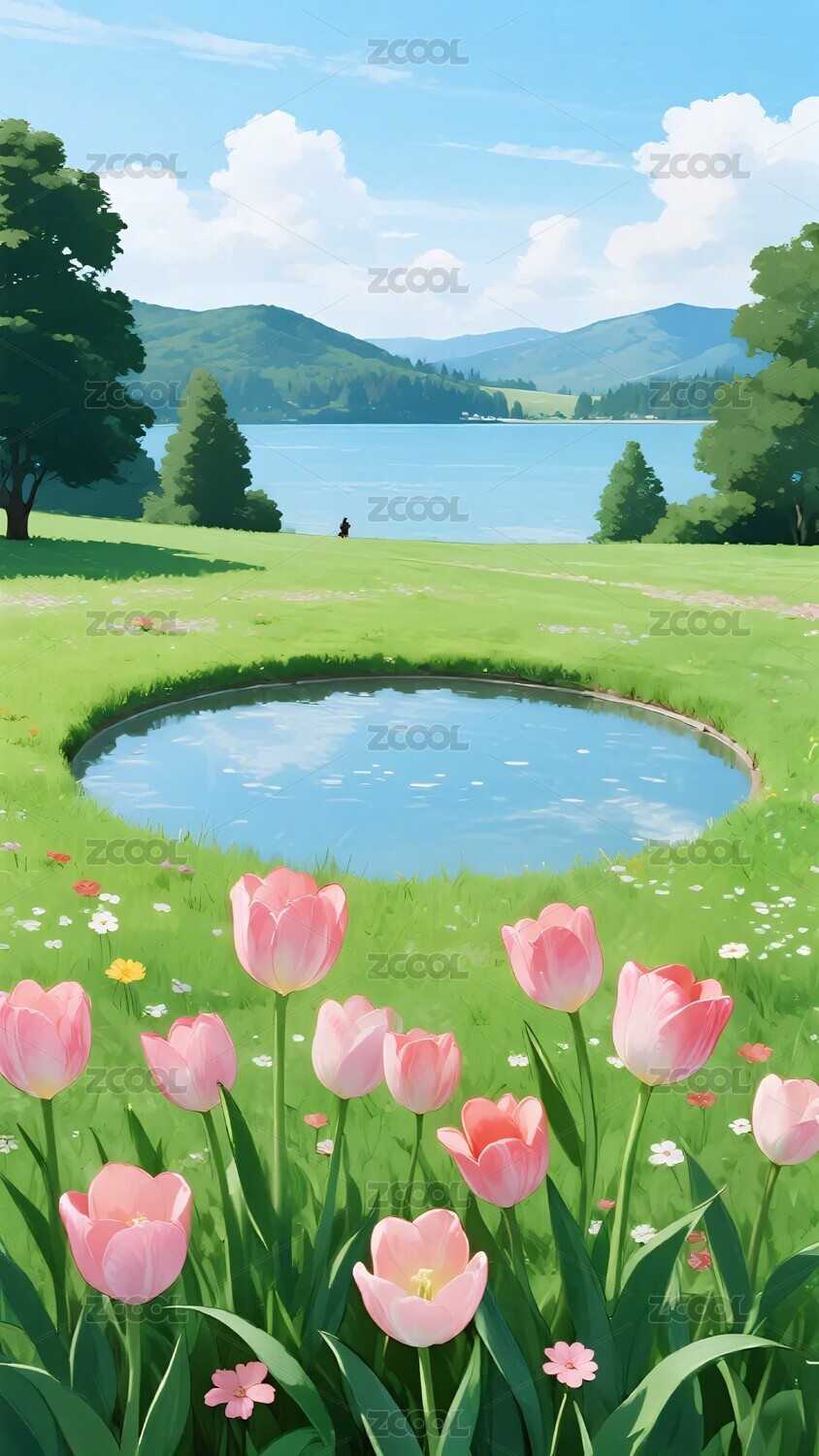 湖畔静美绿叶、花瓣与石头的和谐之景