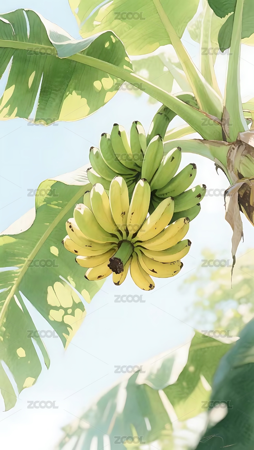 香蕉,蕉叶,果串,鲜黄,翠绿,蓝天,光影,热带,植物,生机