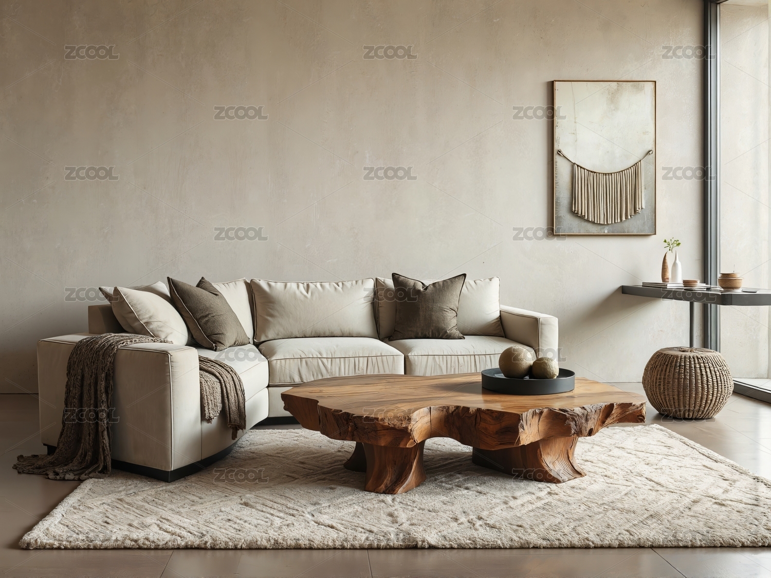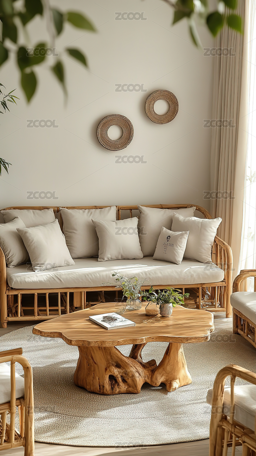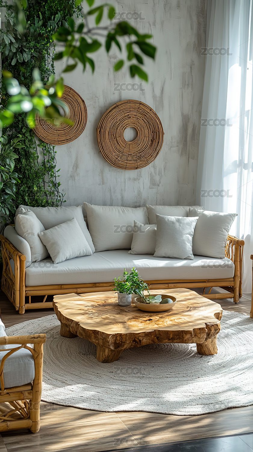 客厅,沙发,茶几,木质,自然,装饰,靠垫,编织,挂毯,阳光