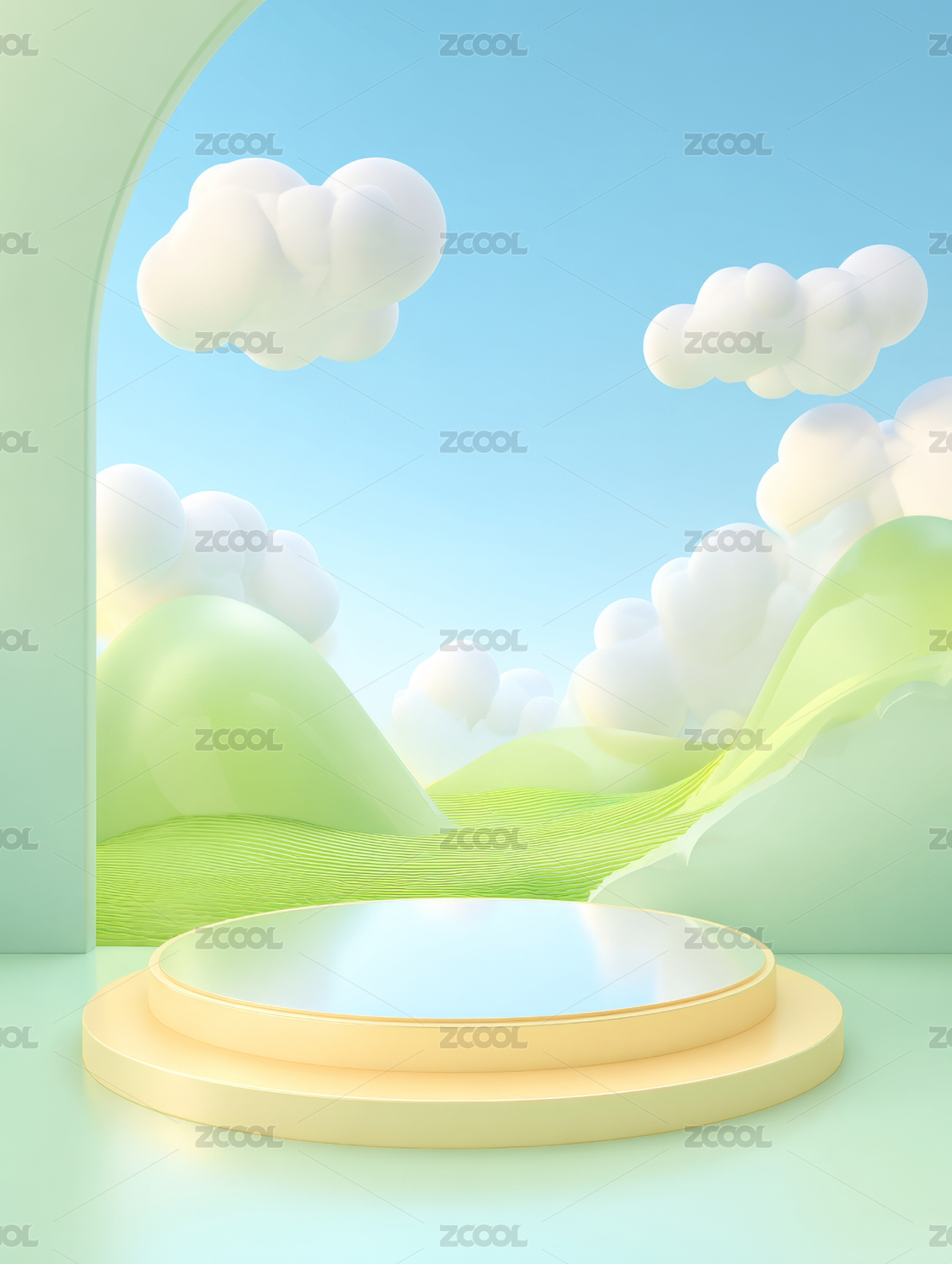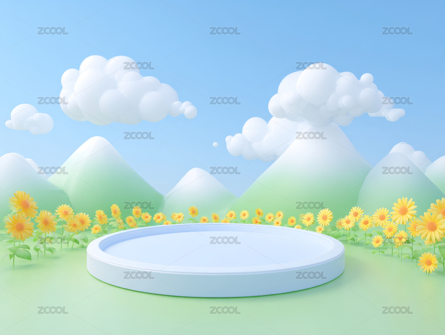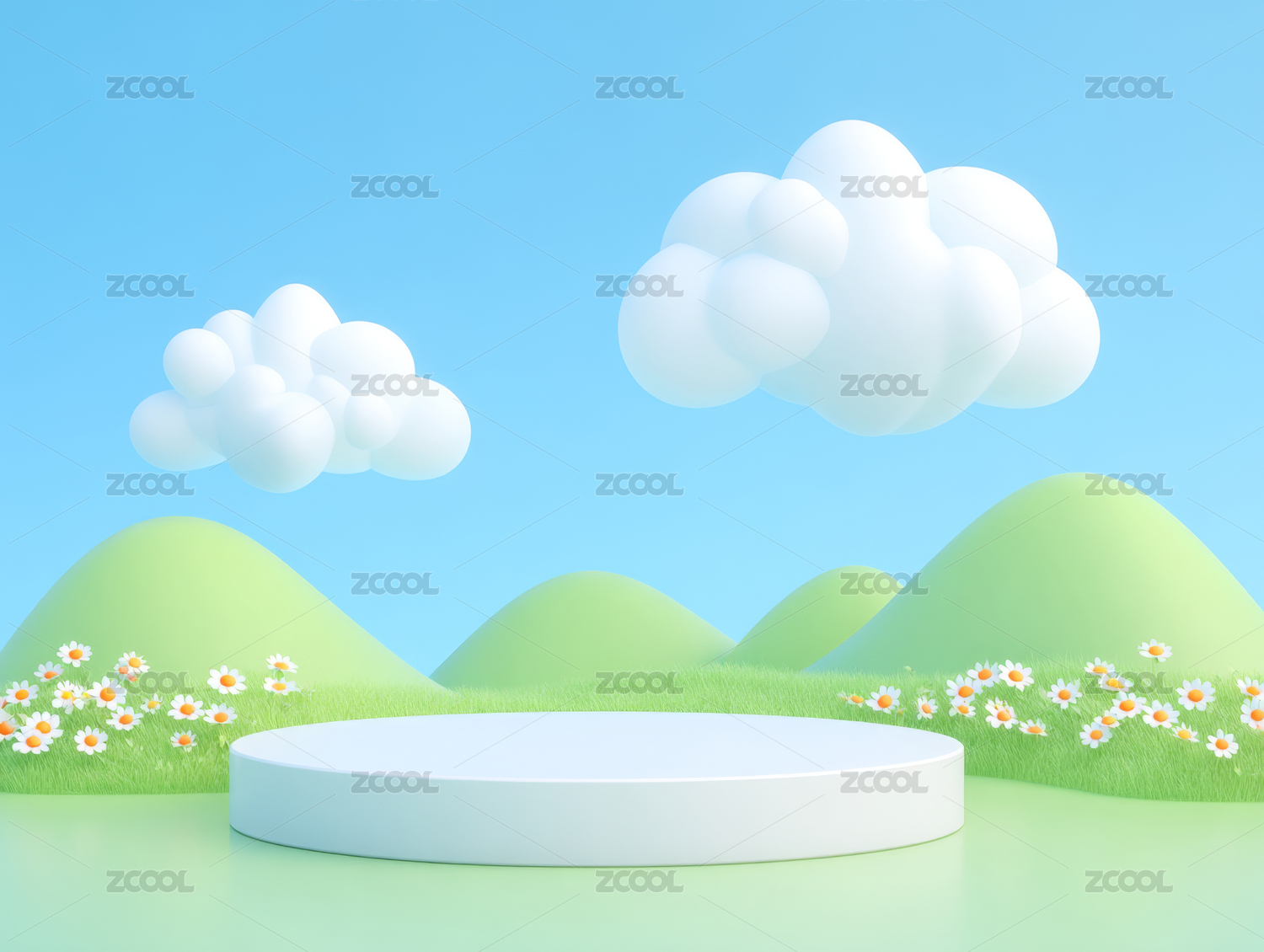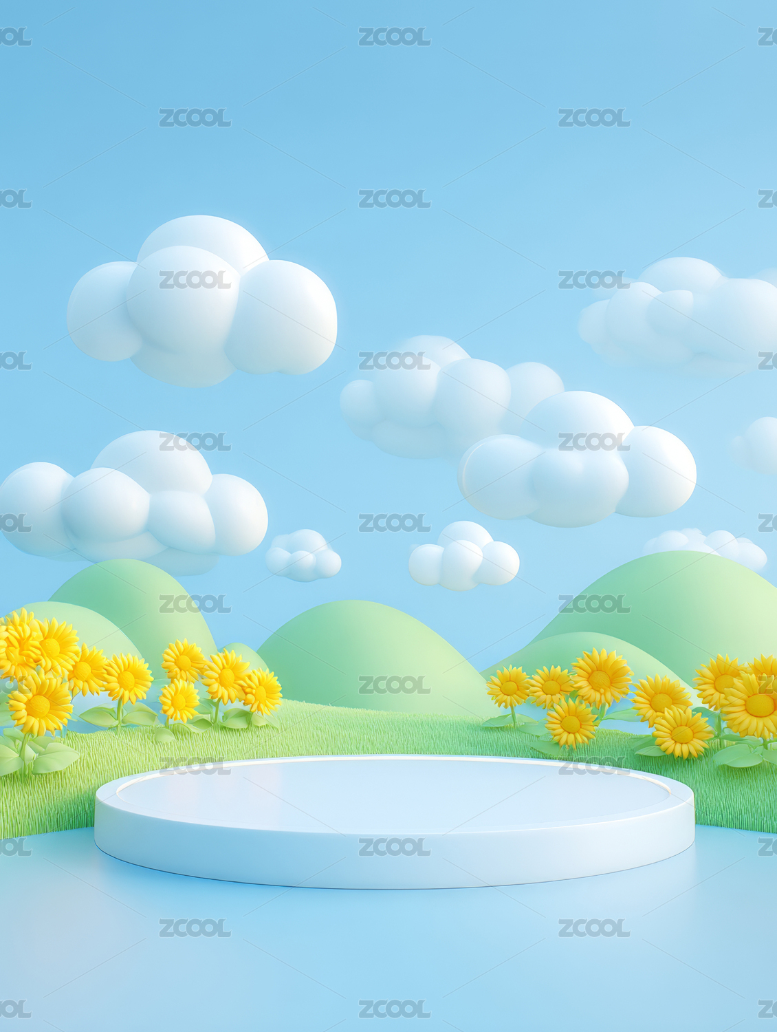 田园,舞台,云朵,山丘,花朵,天空,绿色,清新,卡通,自然