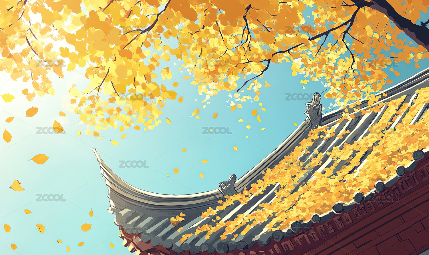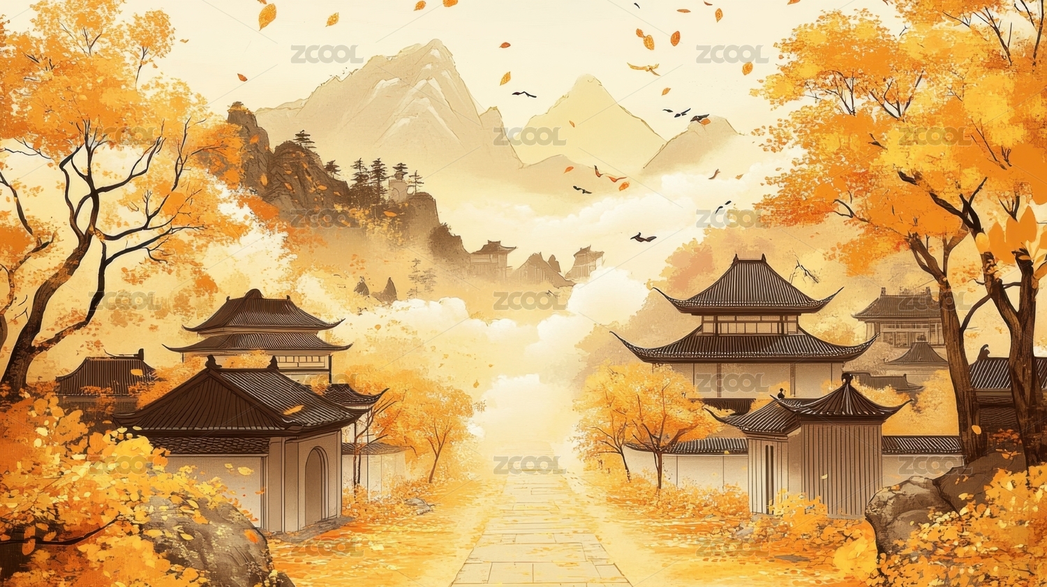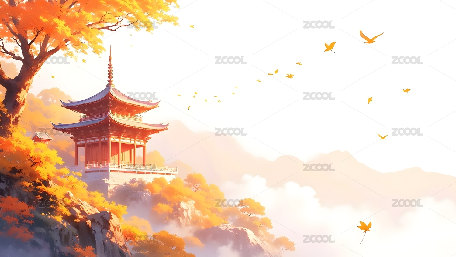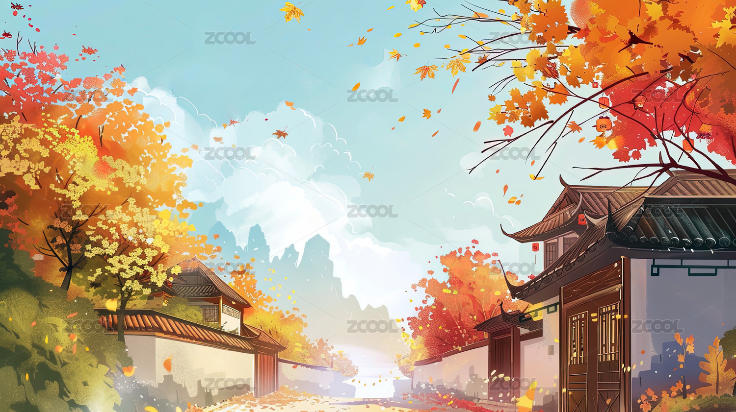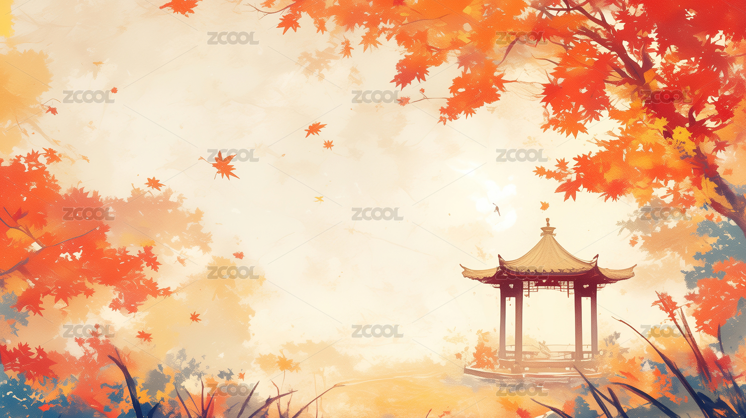 秋天红色枫树叶下中式凉亭建筑风景插画