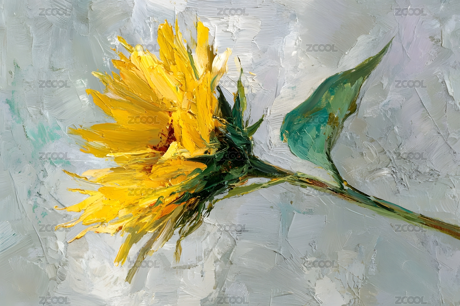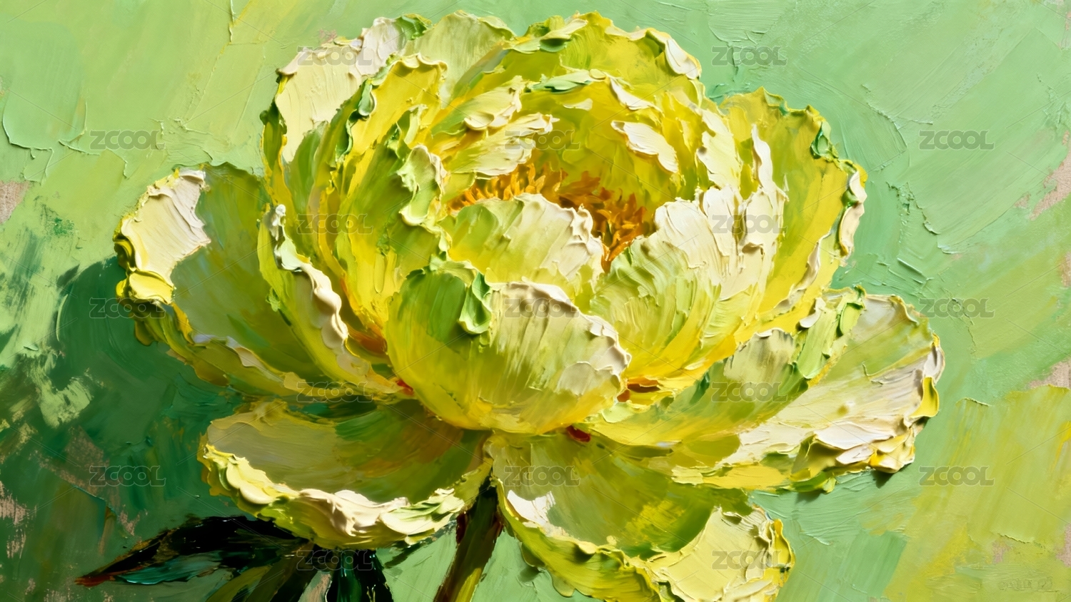 厚涂颜料堆叠黄绿色牡丹花春日花油画