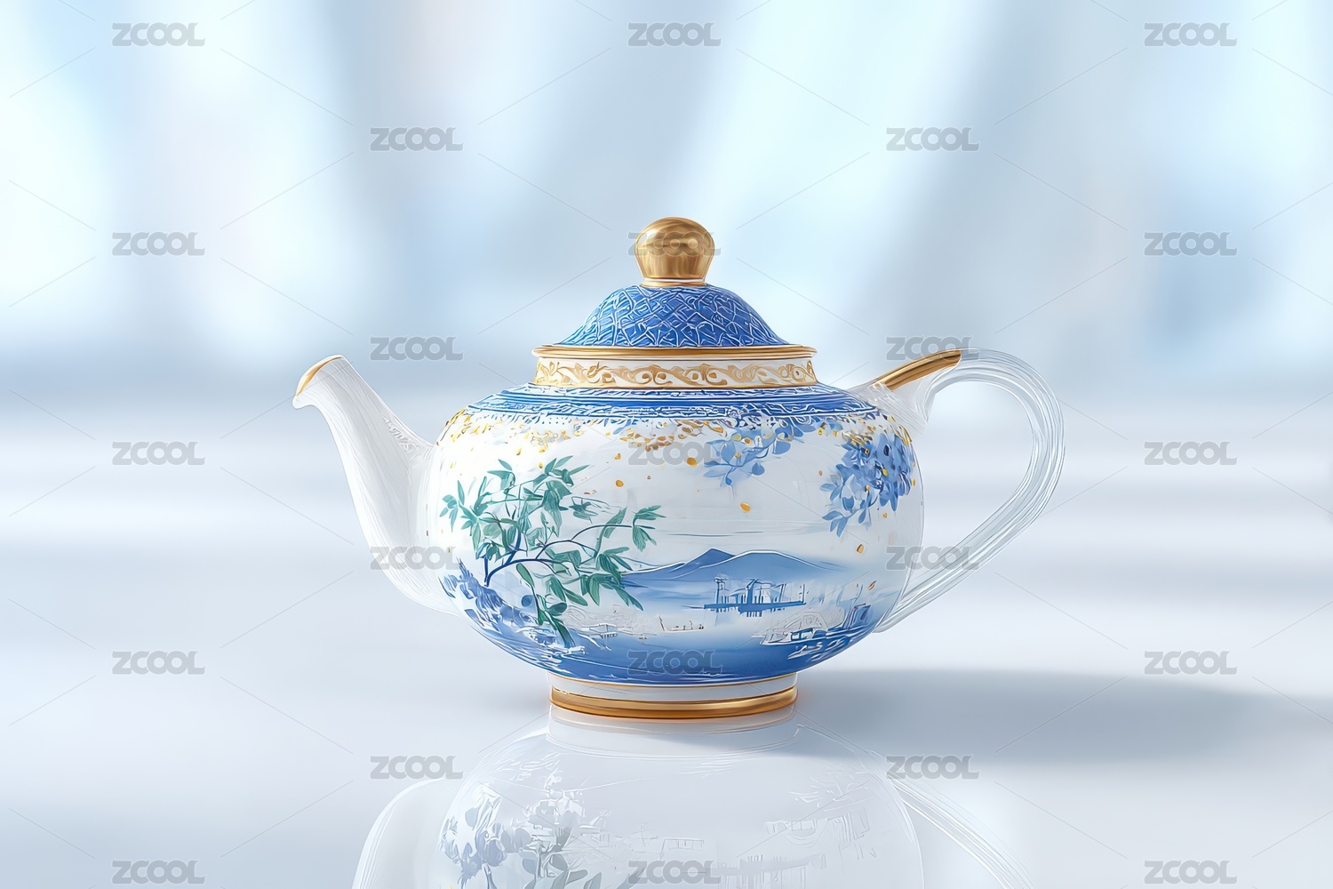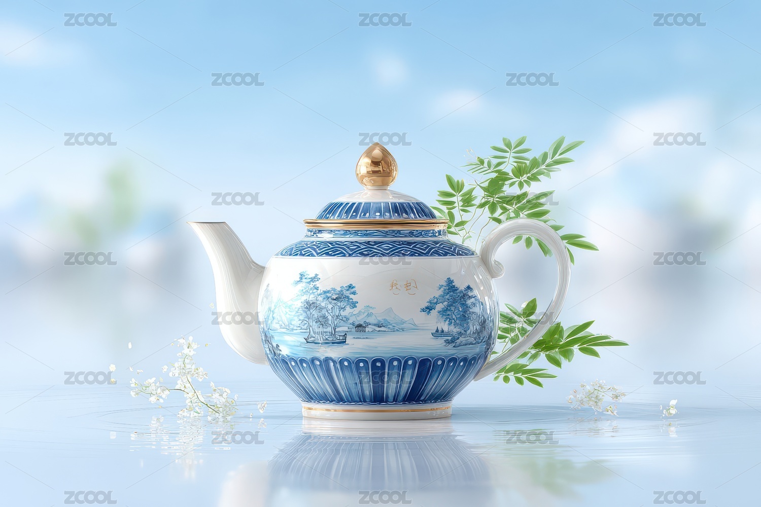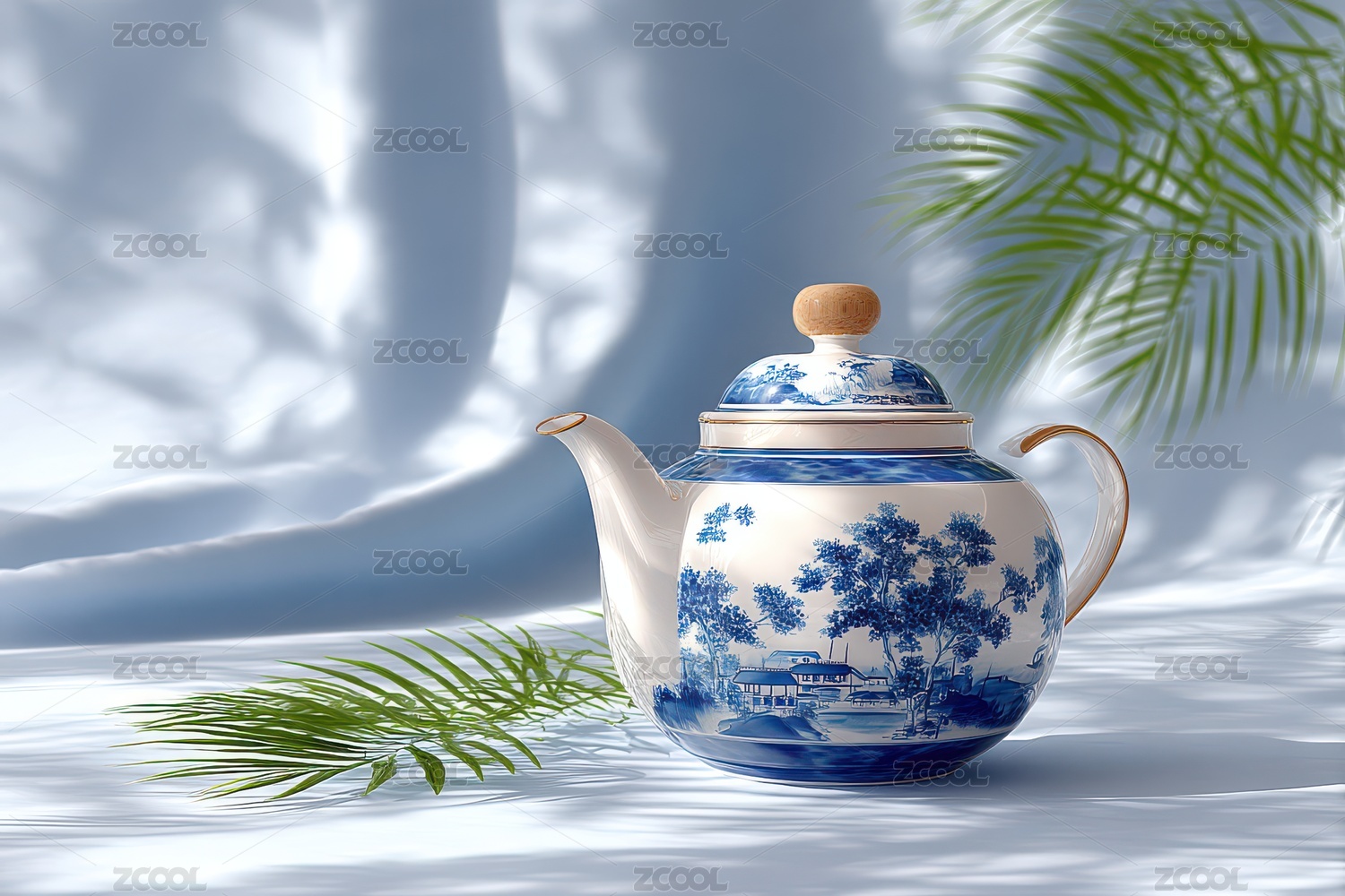 青花瓷茶壶与山水背景的融合艺术