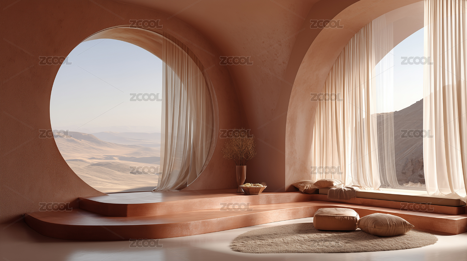空间,桃色,米色,圆窗,窗帘,微风,光线,建筑,几何,细节
