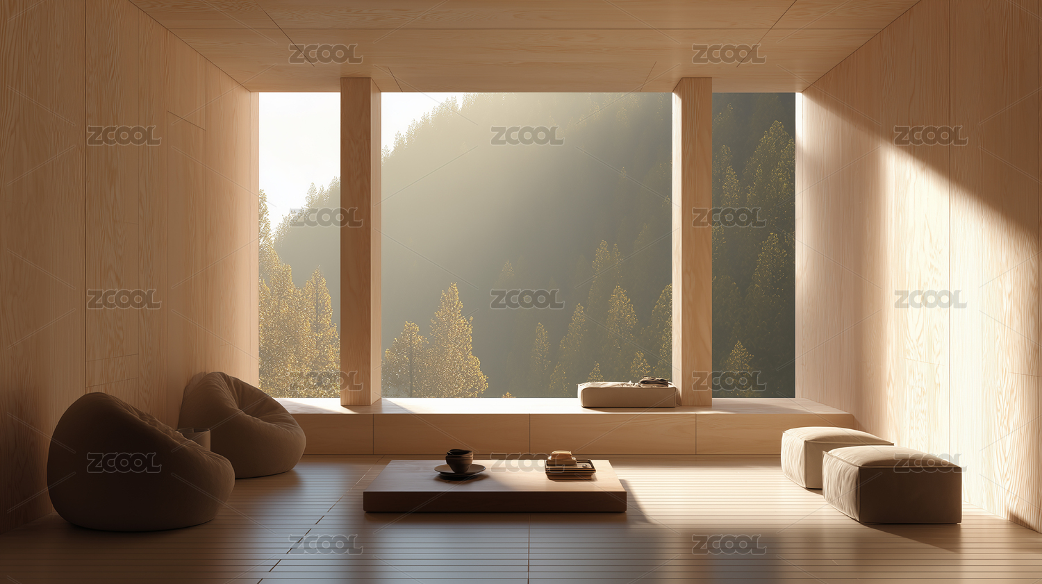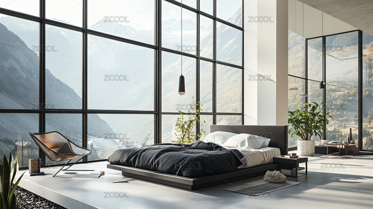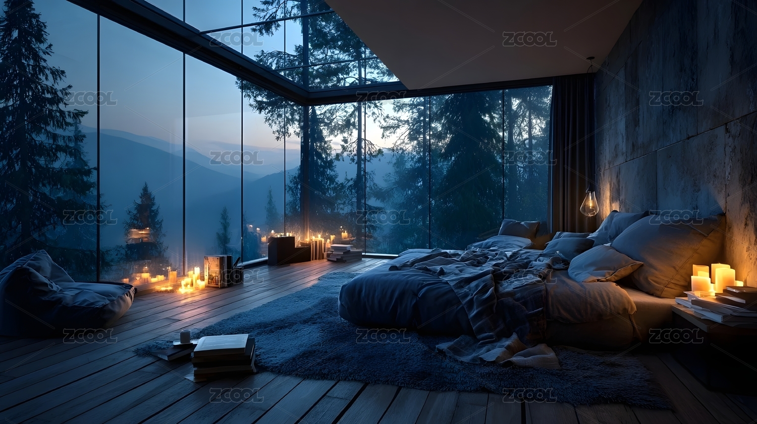 卧室,木质,床架,床品,吊灯,黑色,灯光,金色,窗户,森林