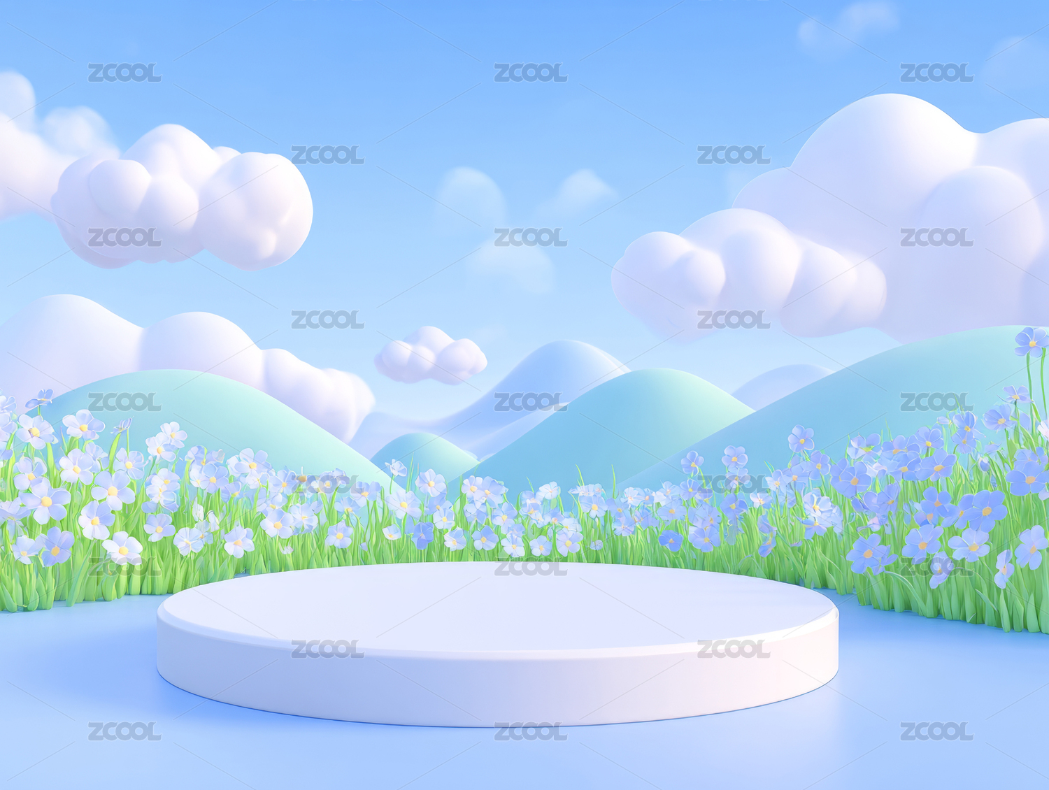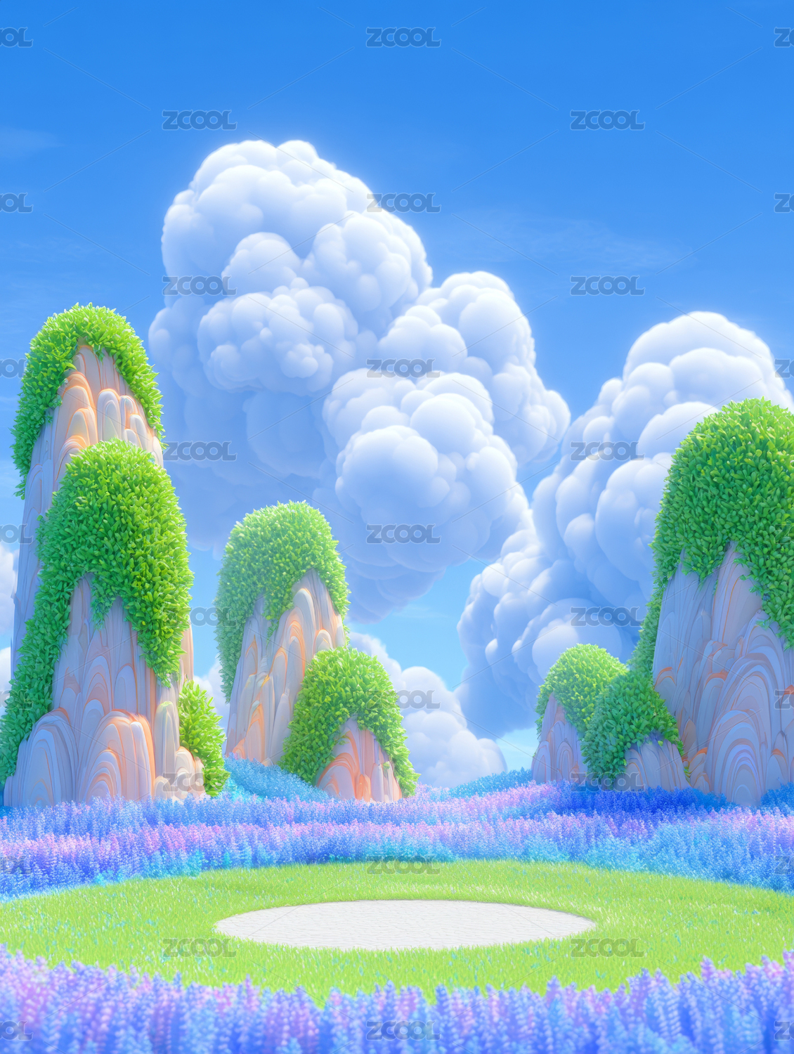 云朵,山脉,草地,舞台,花朵,蓝天,卡通,自然,梦幻