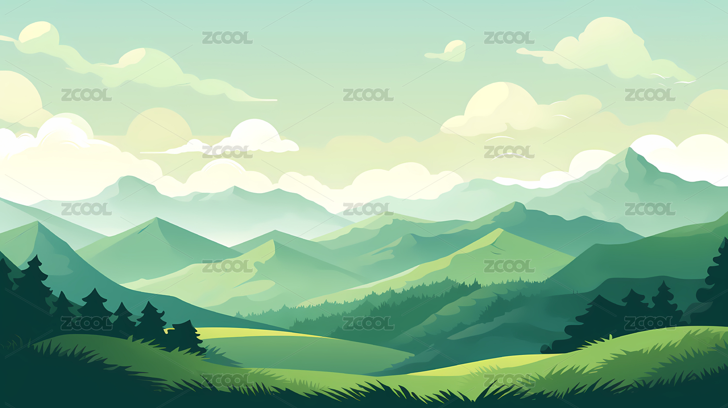 手绘卡通夏天的草地和山脉插画