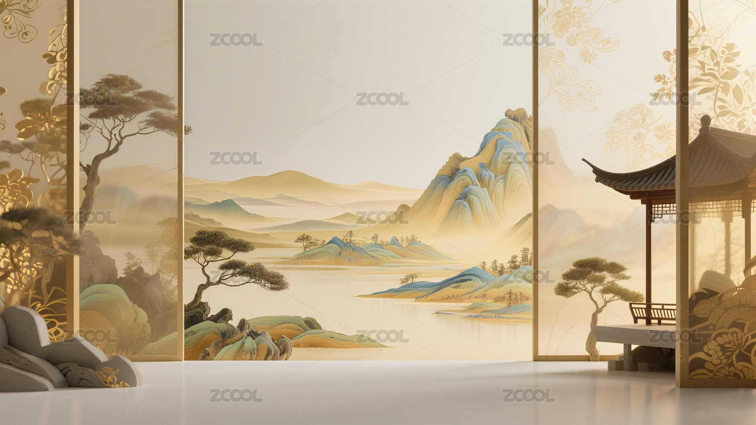 3D立体屏风山水画电商背景
