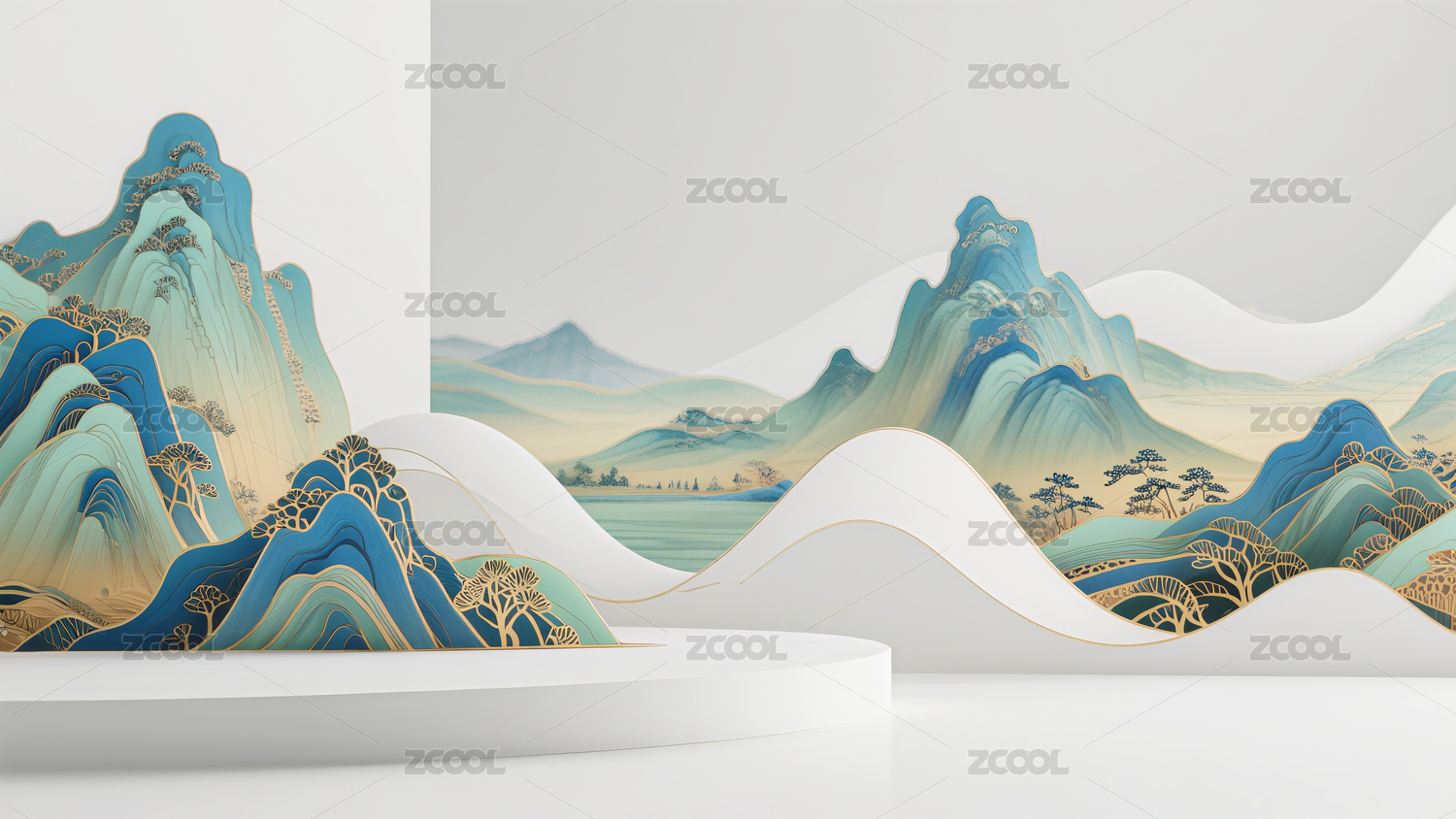 新中式水墨3D立体前卫千里江山图背景