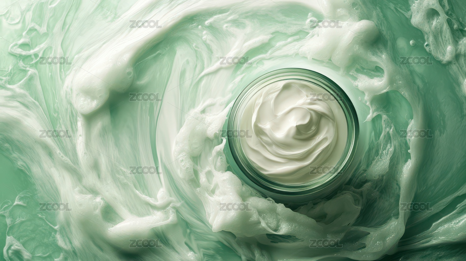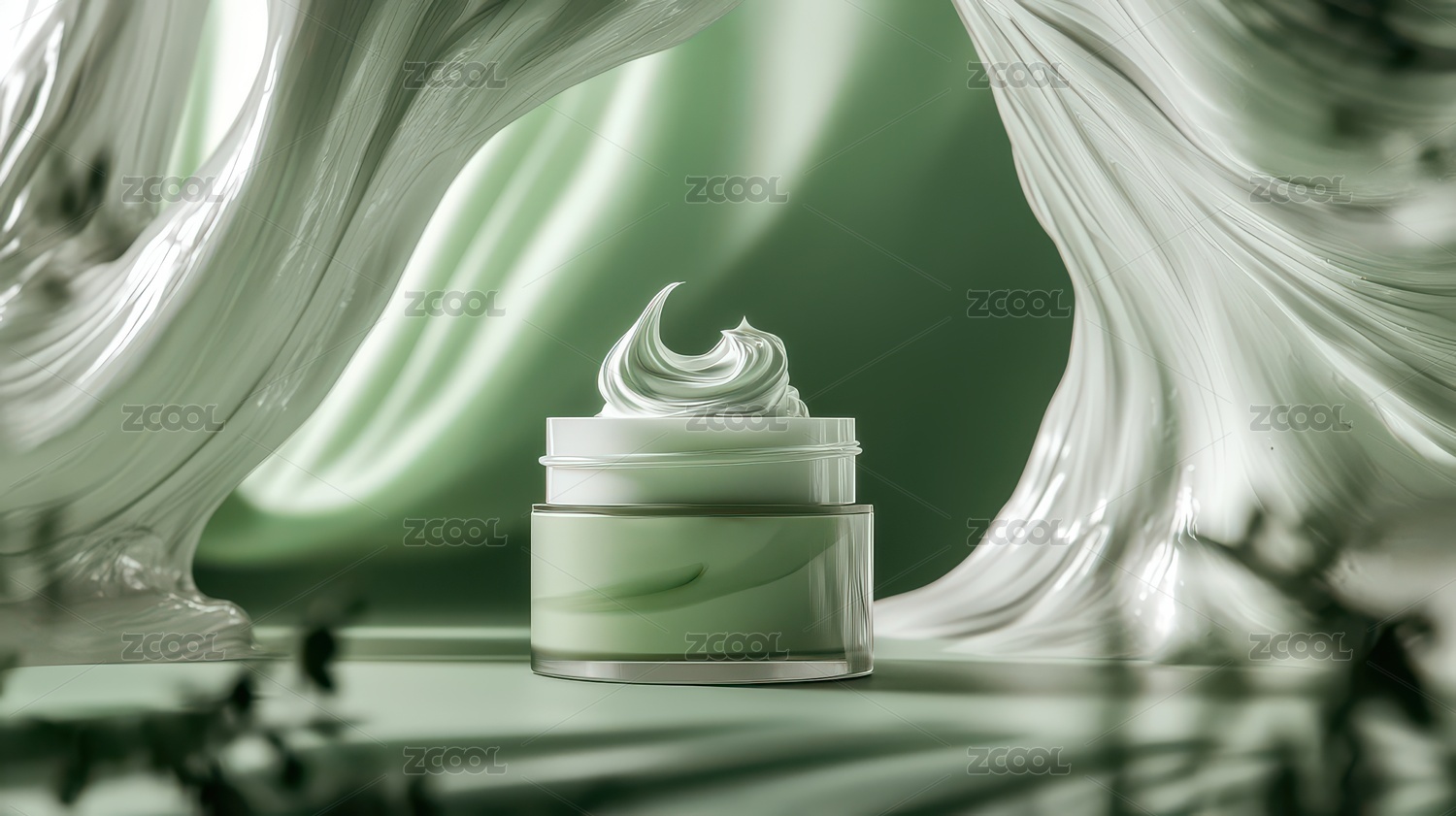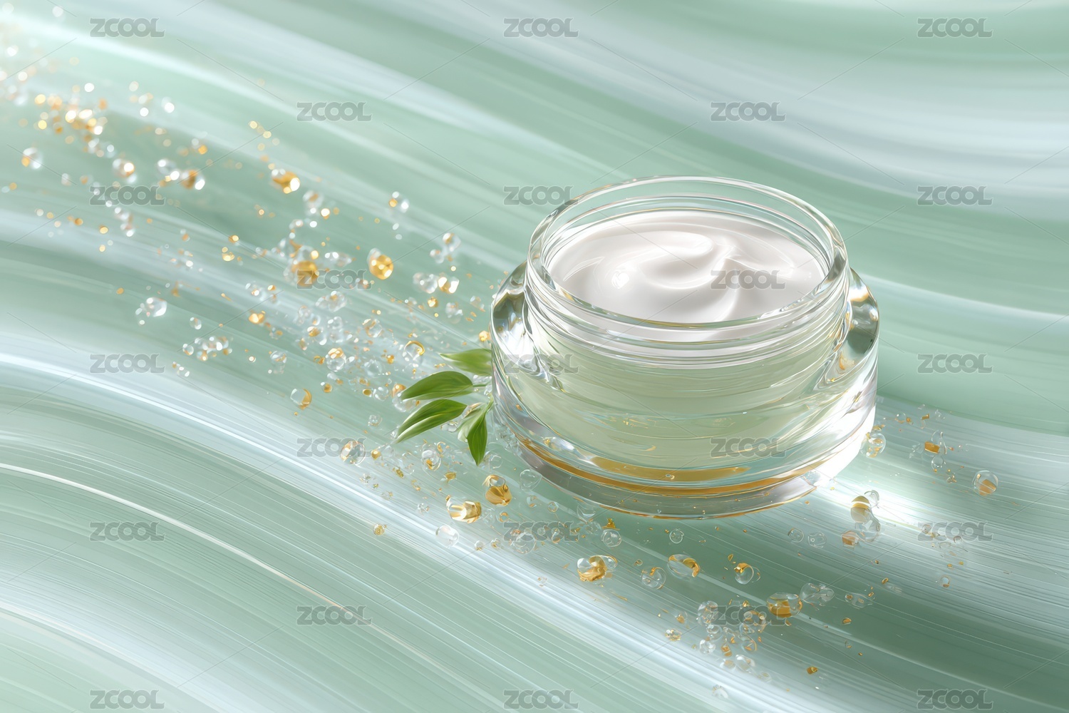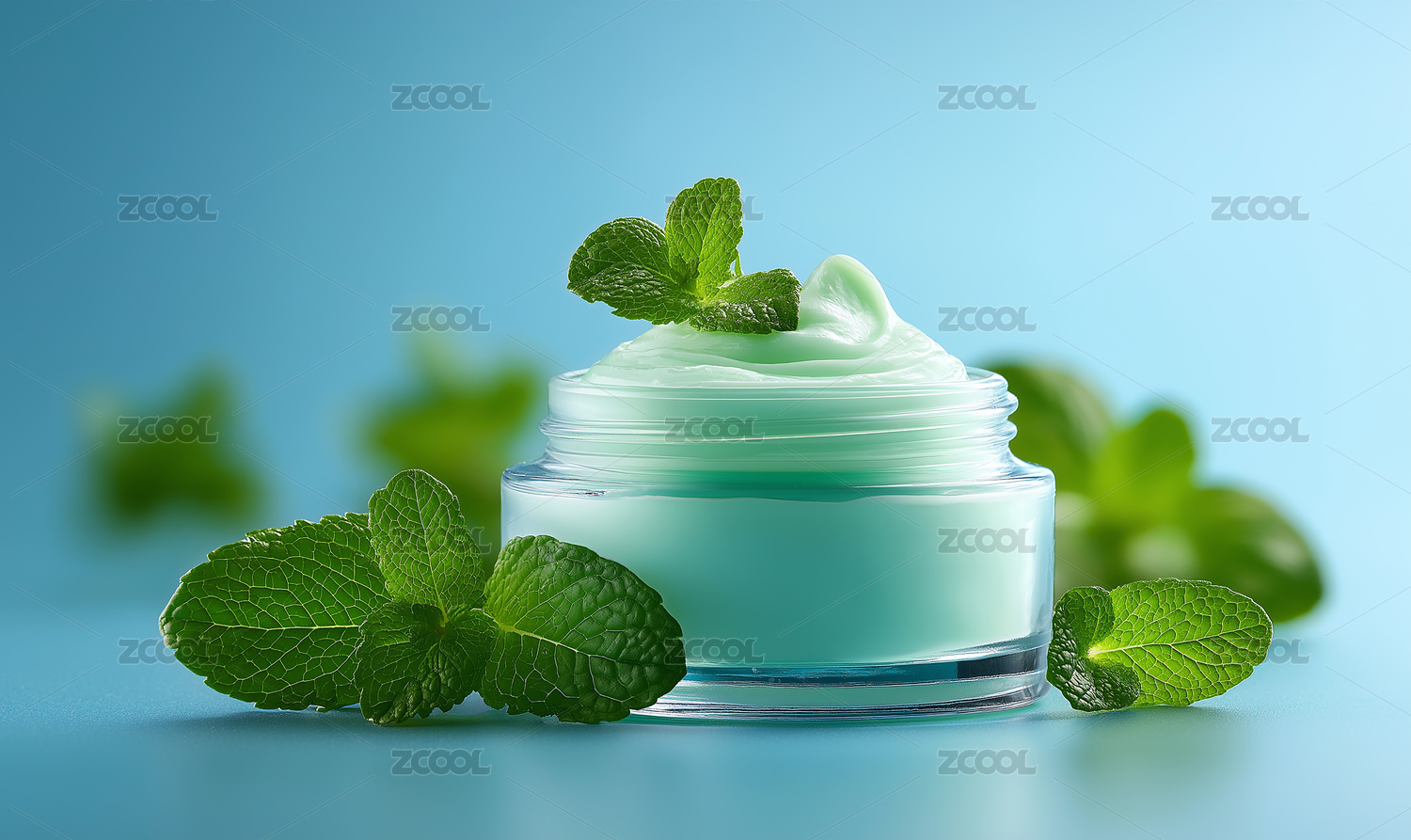 薄荷绿叶围绕的薄荷绿面霜玻璃罐