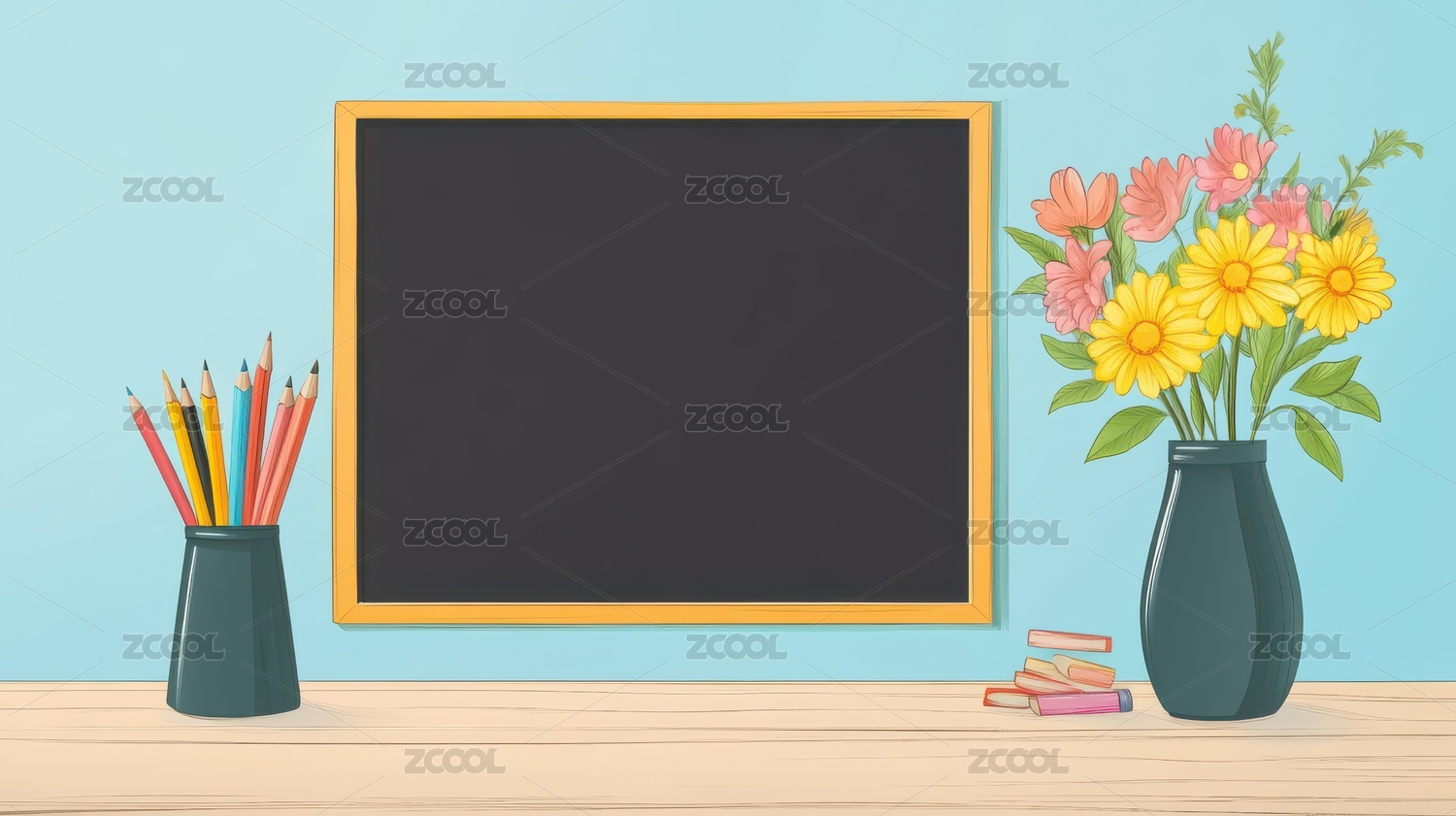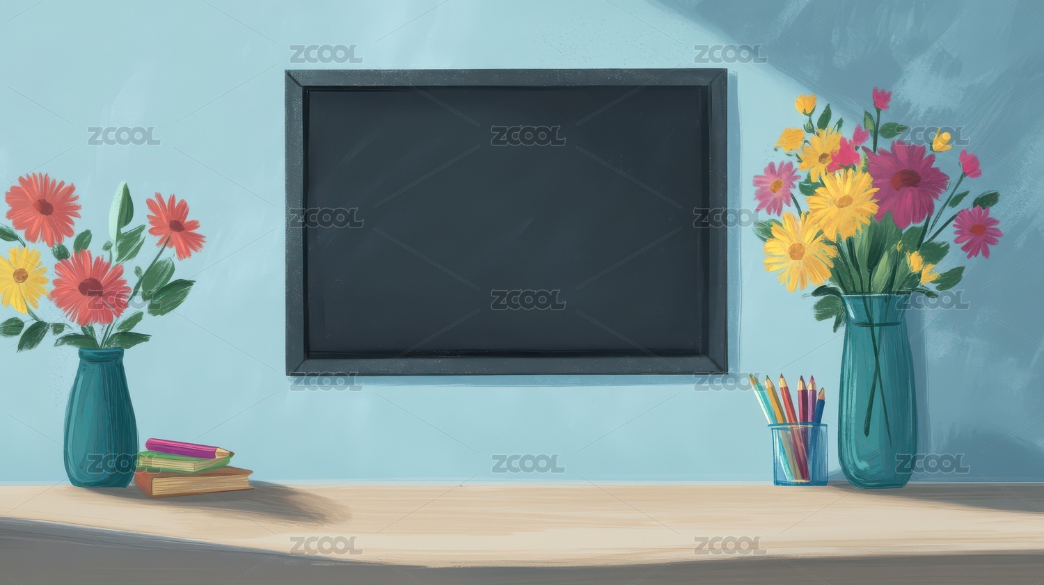 黑板,书本,花束,教室,装饰,笔筒,桌子,阳光
