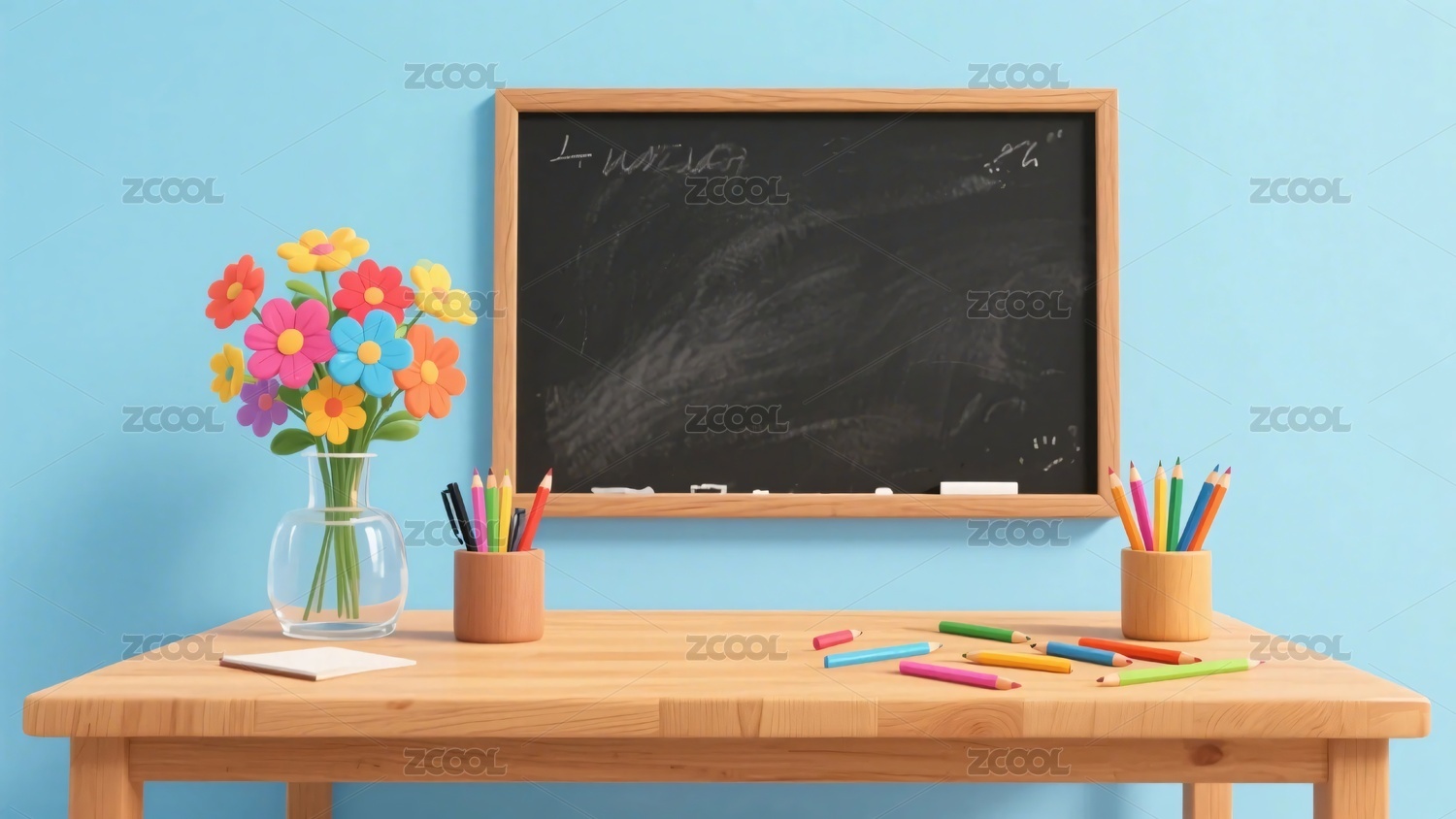 蓝色,黑板,文具,鲜花,铅笔,花瓶,桌台,粉黄