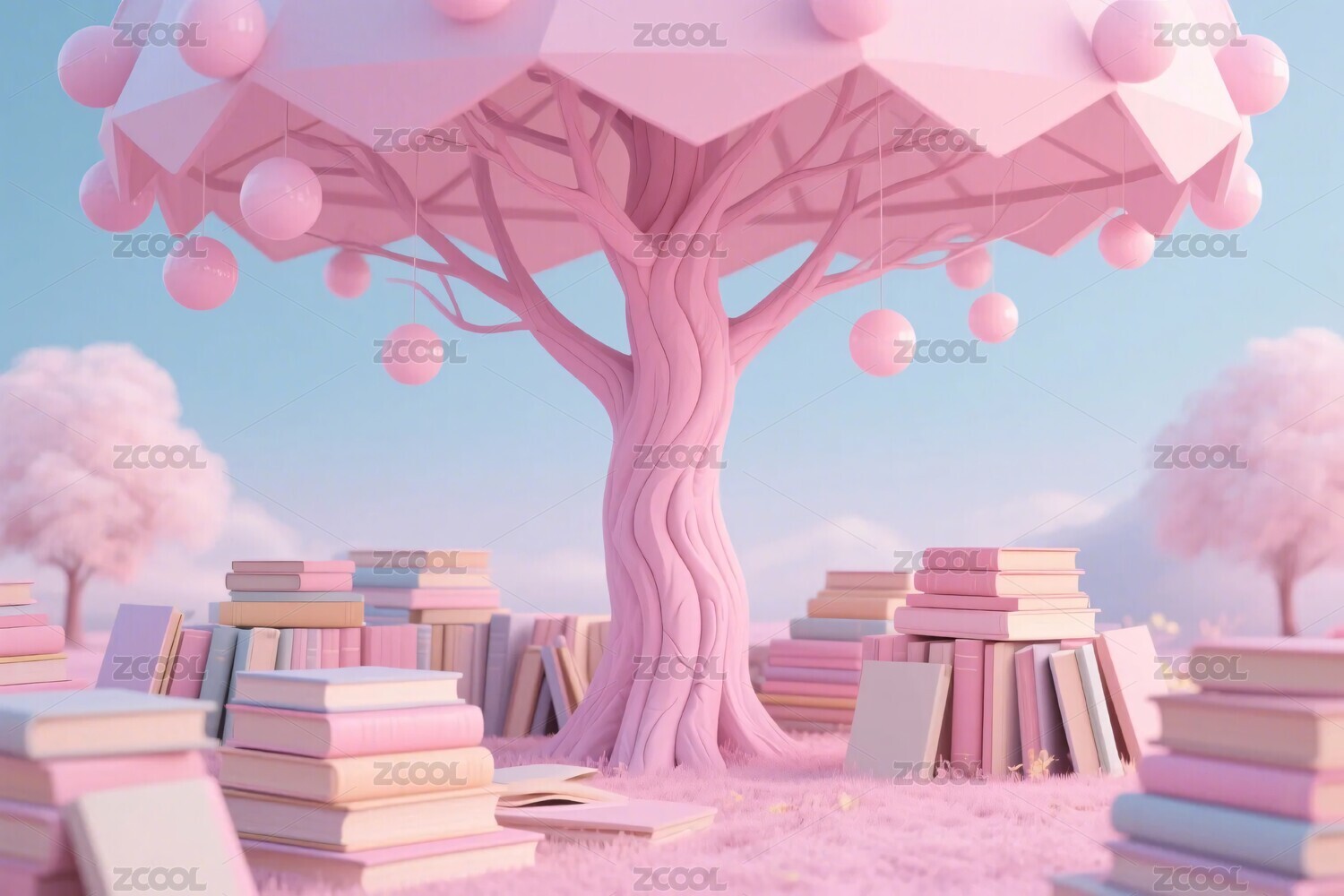 粉色树与书堆的梦幻场景