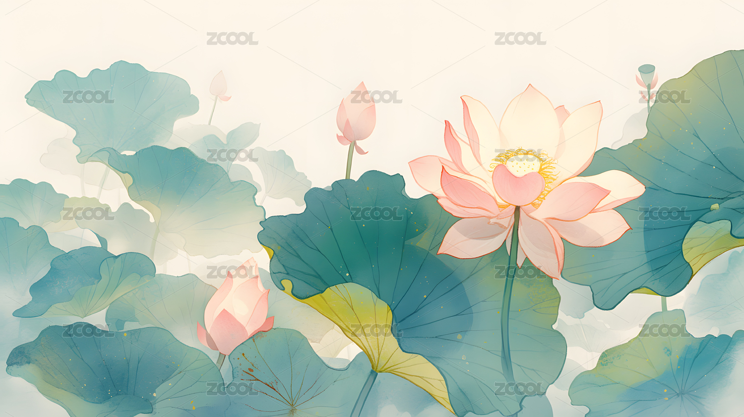 荷花荷塘唯美插画