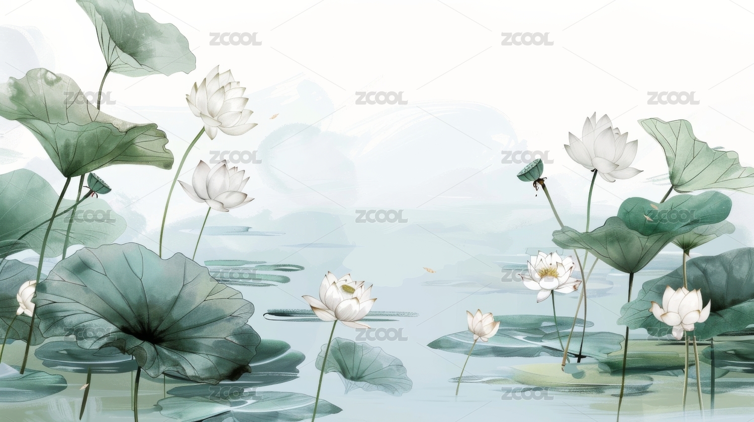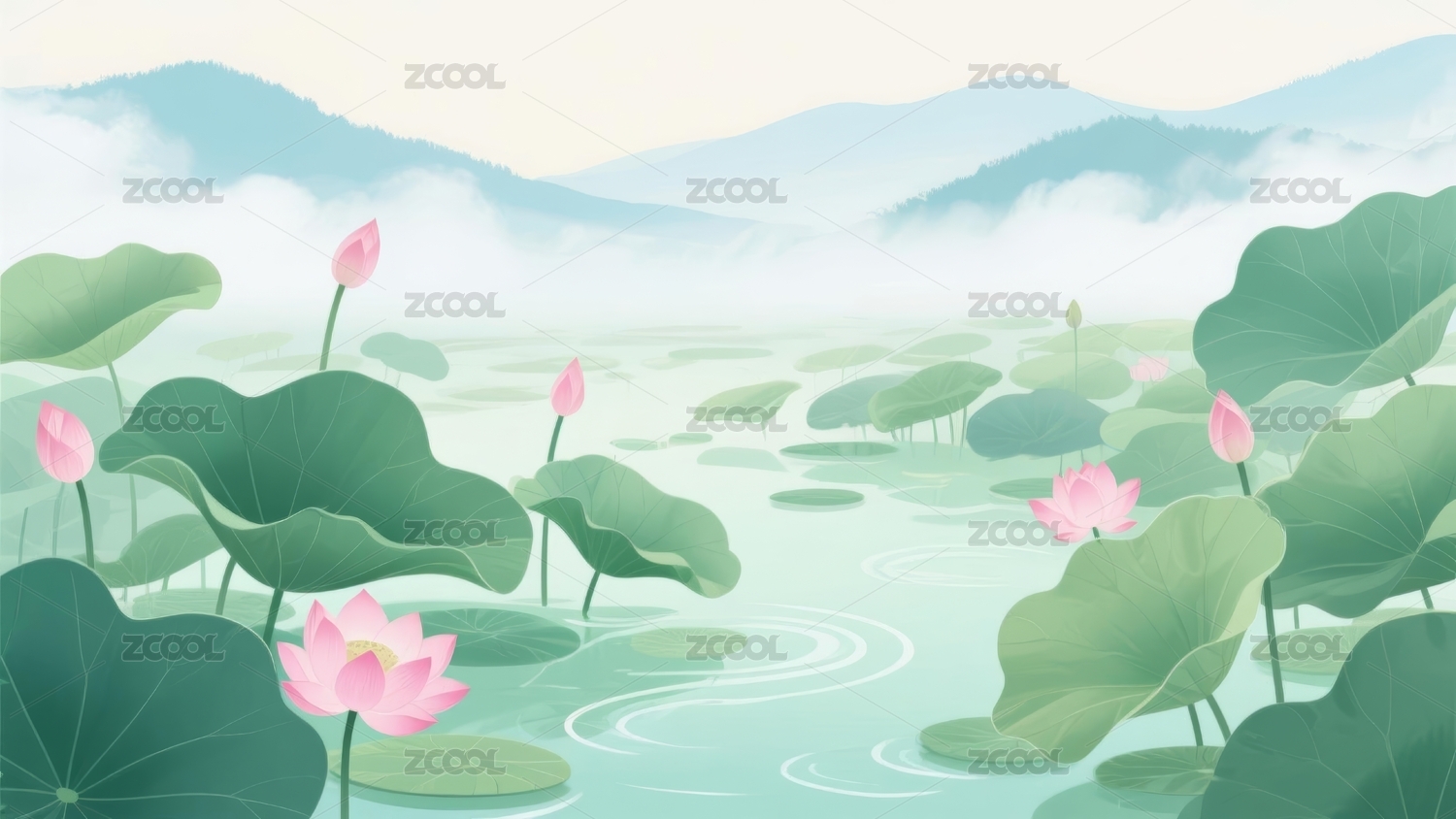 莲花,荷叶,池塘,花朵,水面,蜜蜂,绿叶,山影