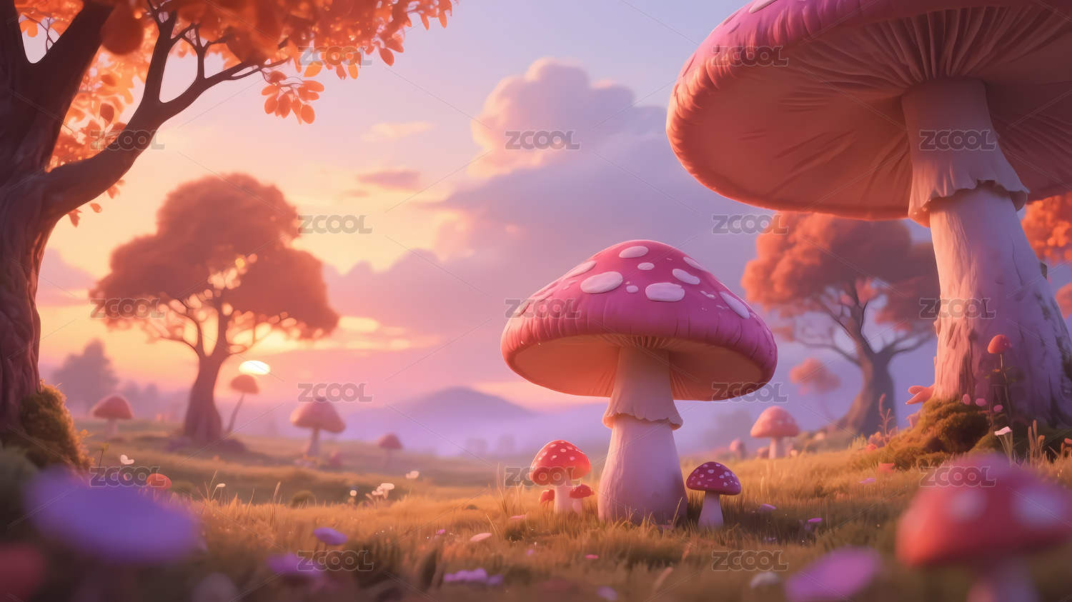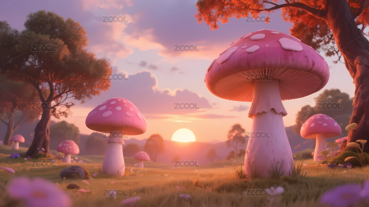 夕阳下的彩色蘑菇