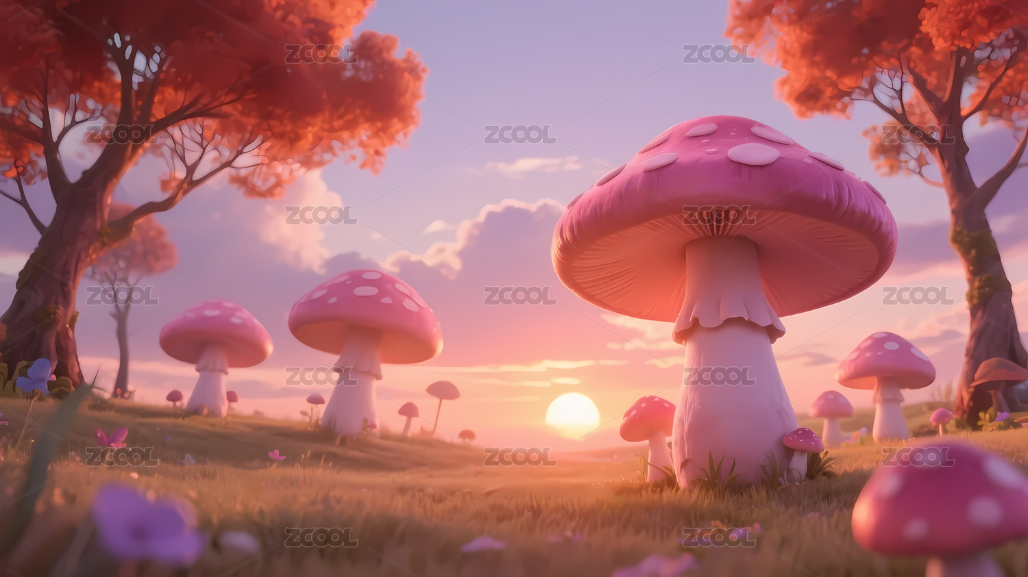 梦幻蘑菇与花朵的场景