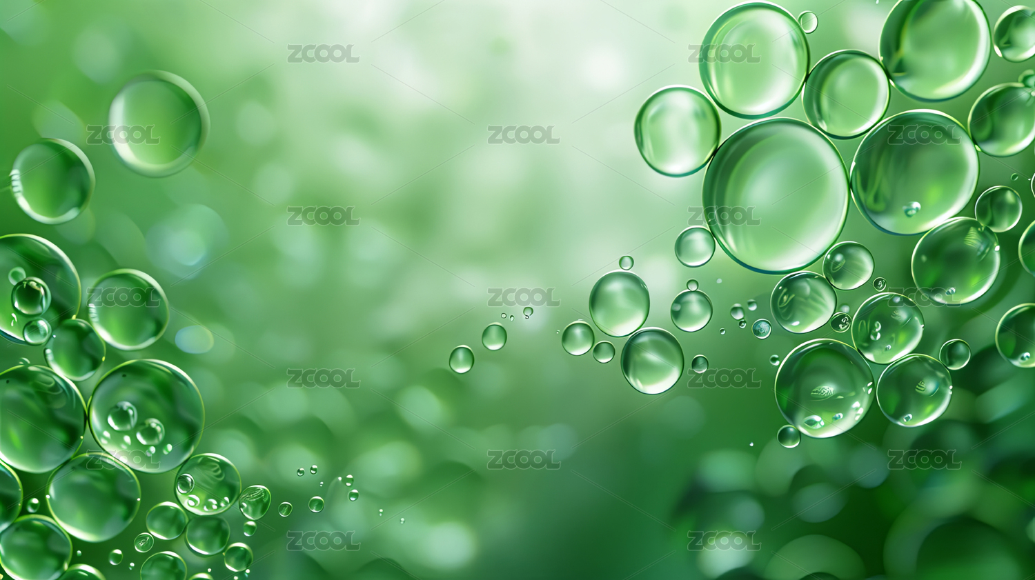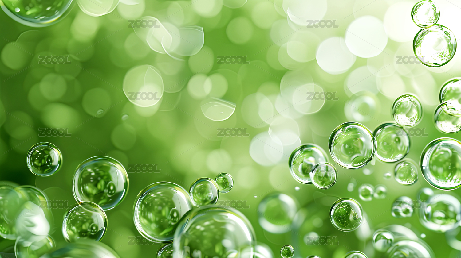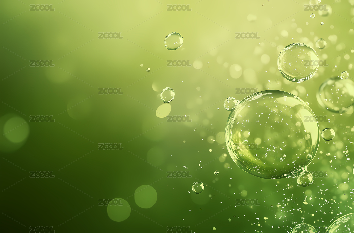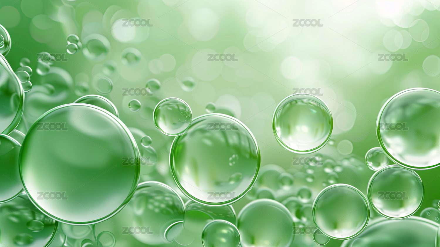 光滑水面绿色背景中的泡泡化妆品成分插图