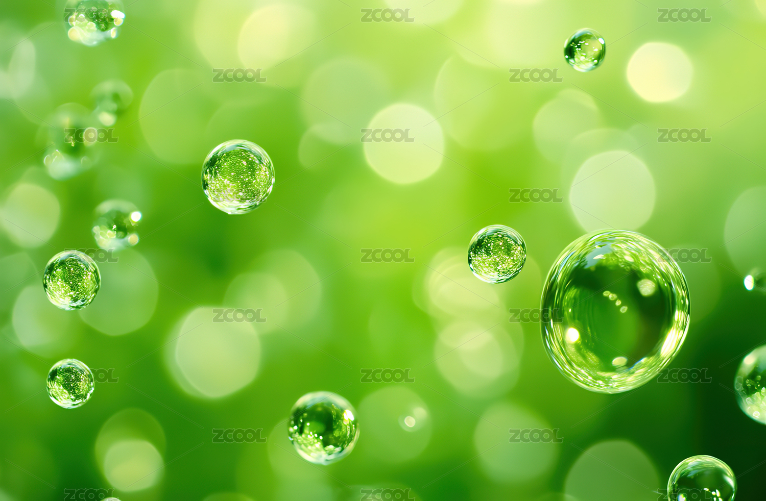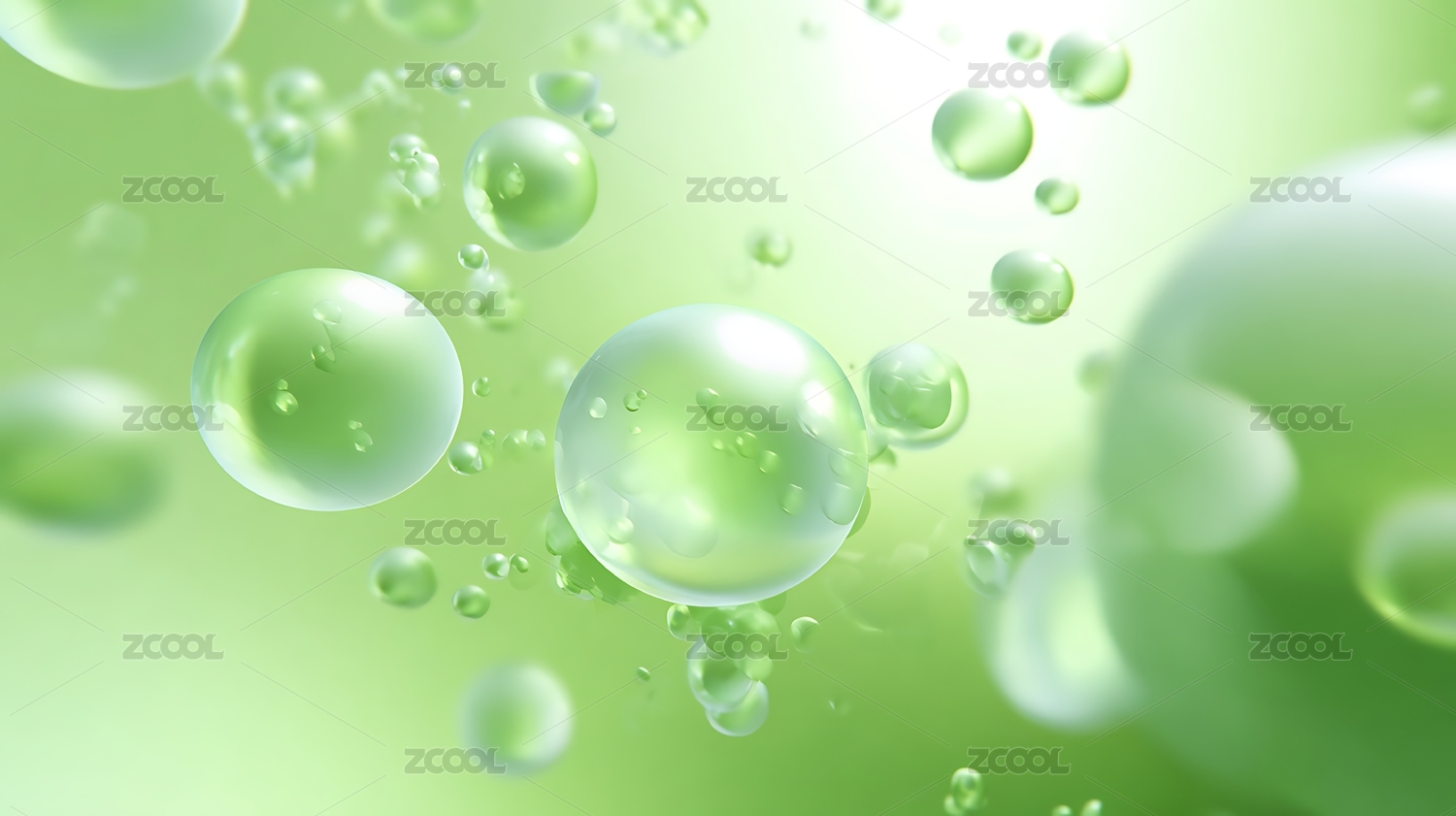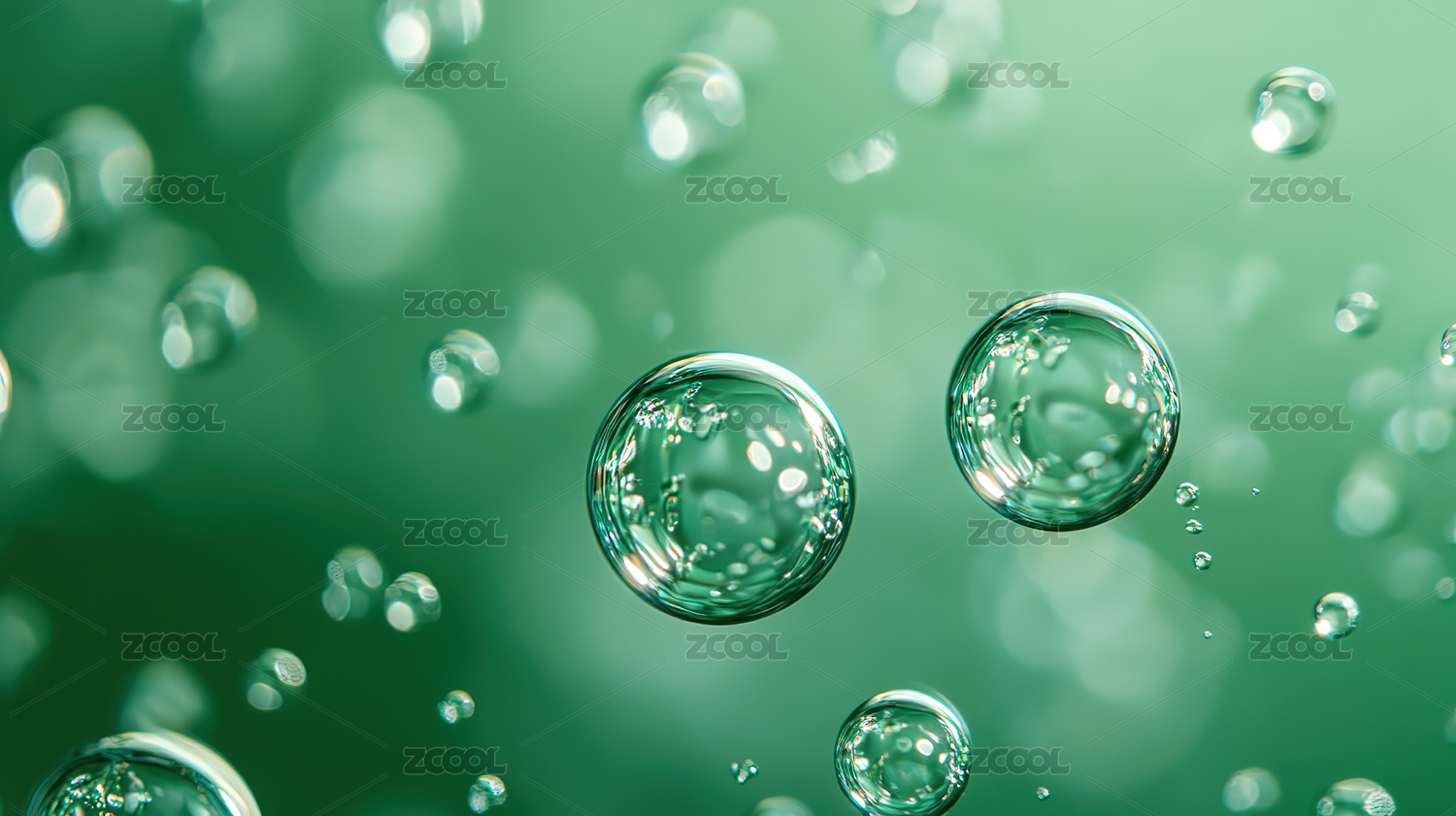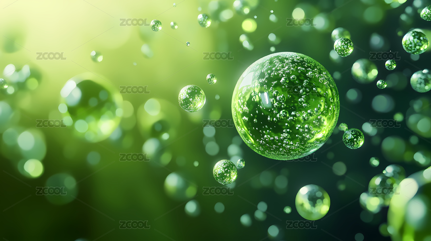 光滑水面绿色背景中的泡泡化妆品成分插图