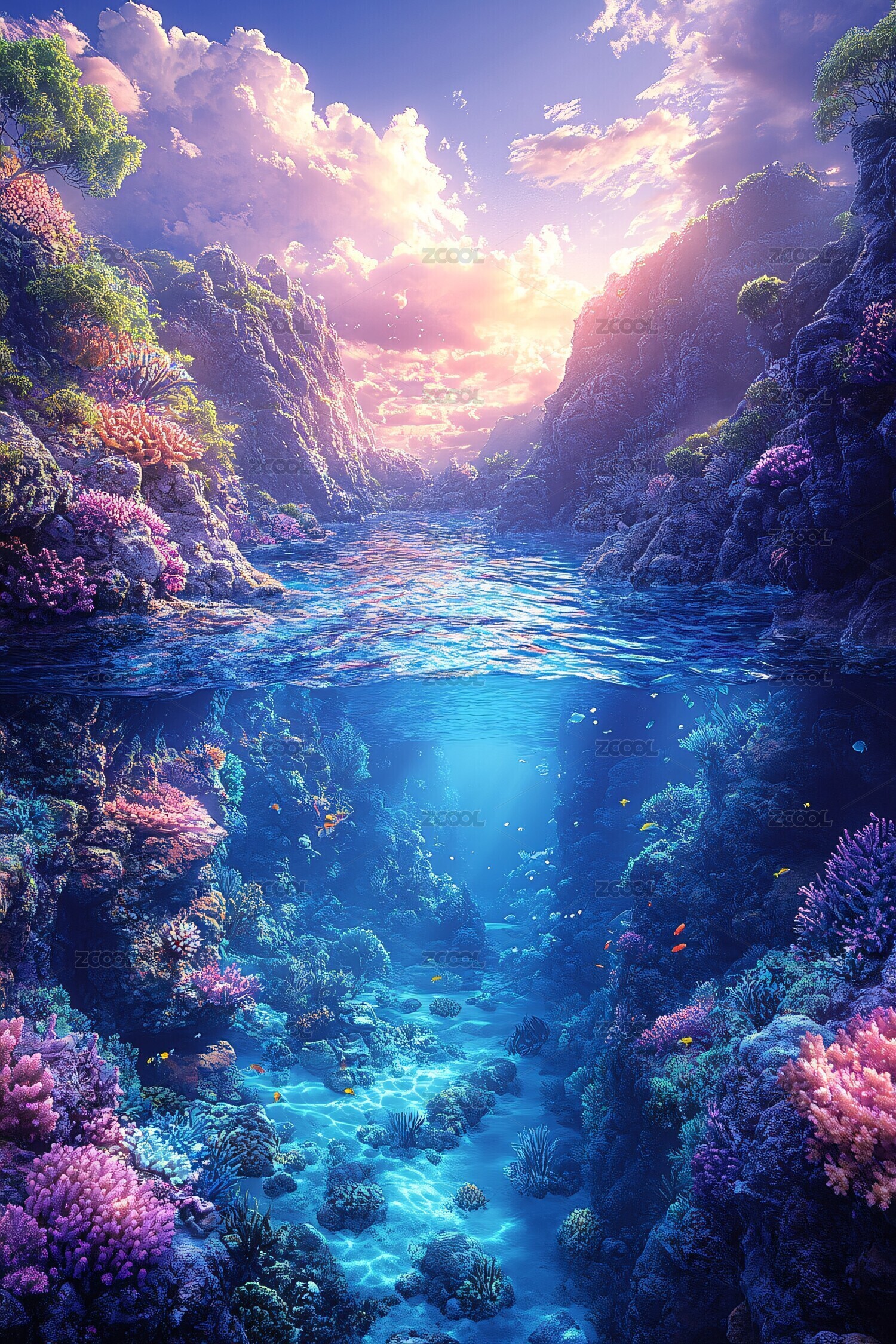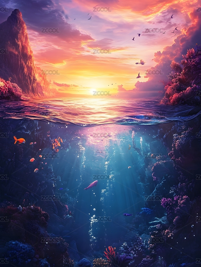 海底珊瑚礁夕阳美景