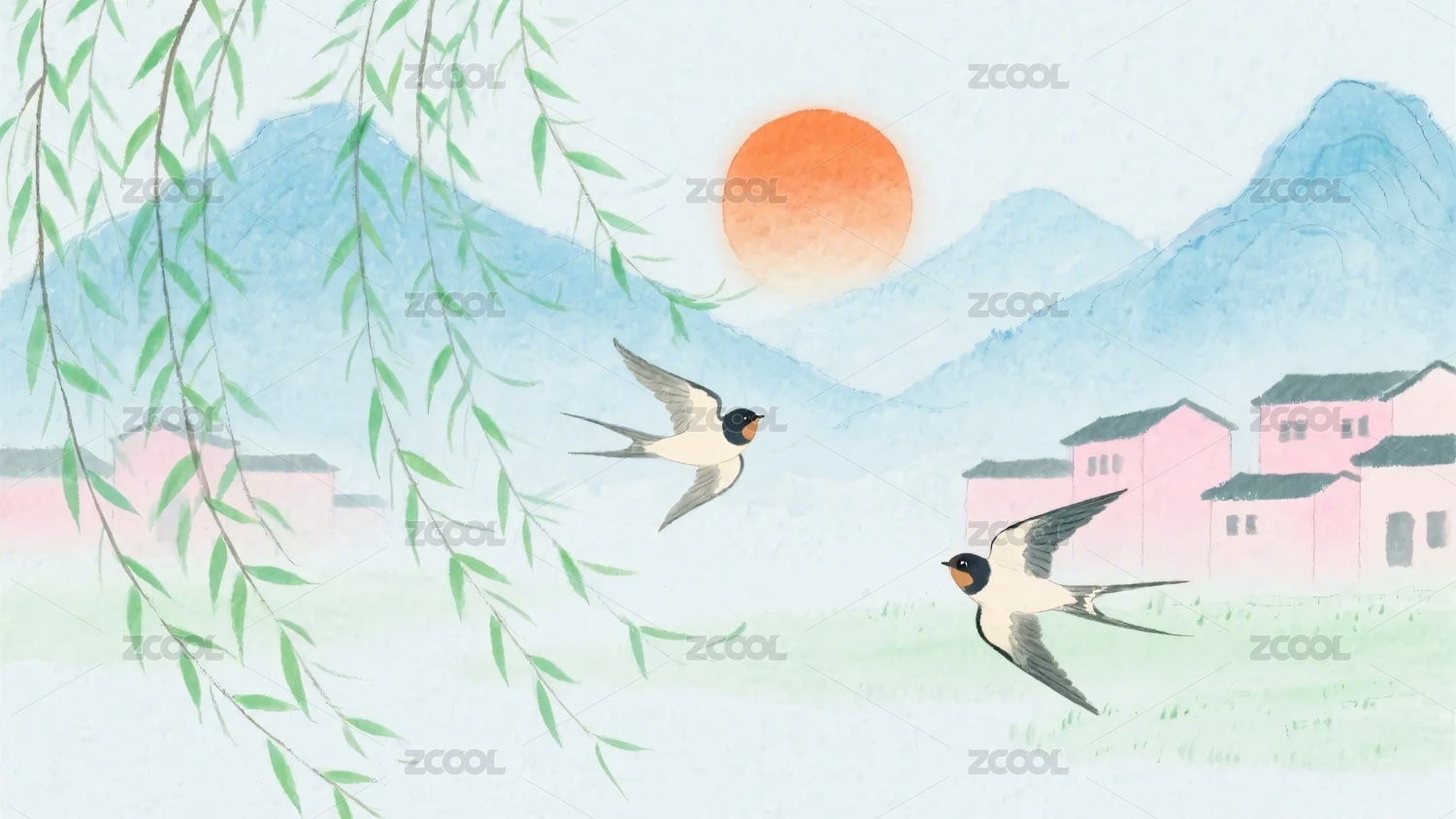 燕子,柳树,房屋,山水,红日,水墨画,插画,风景,春天,中式