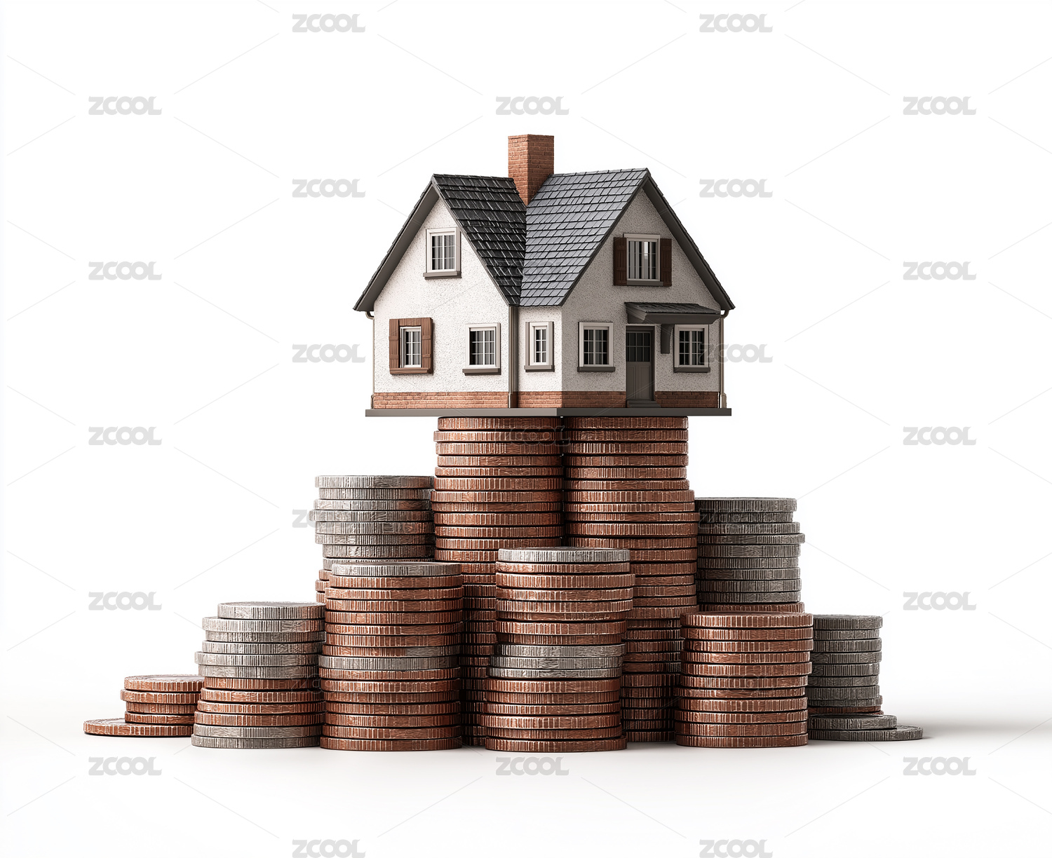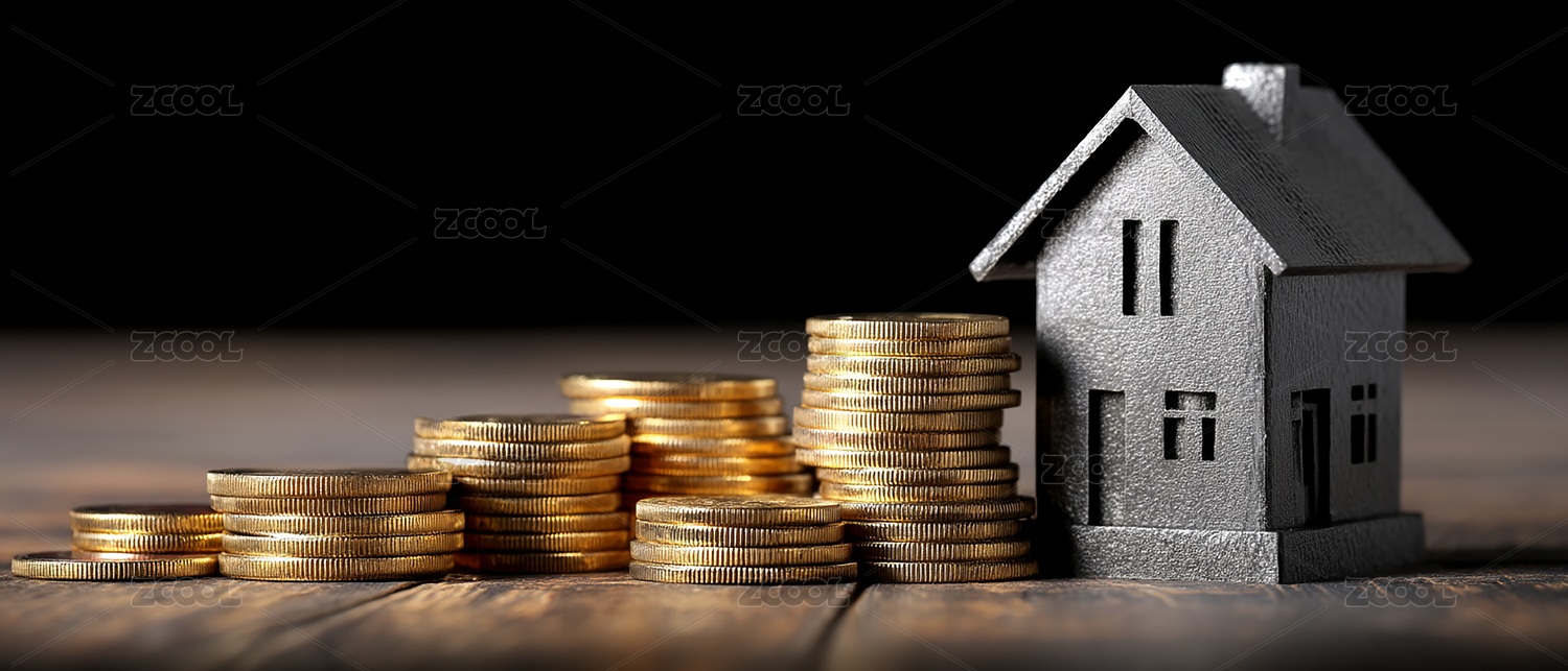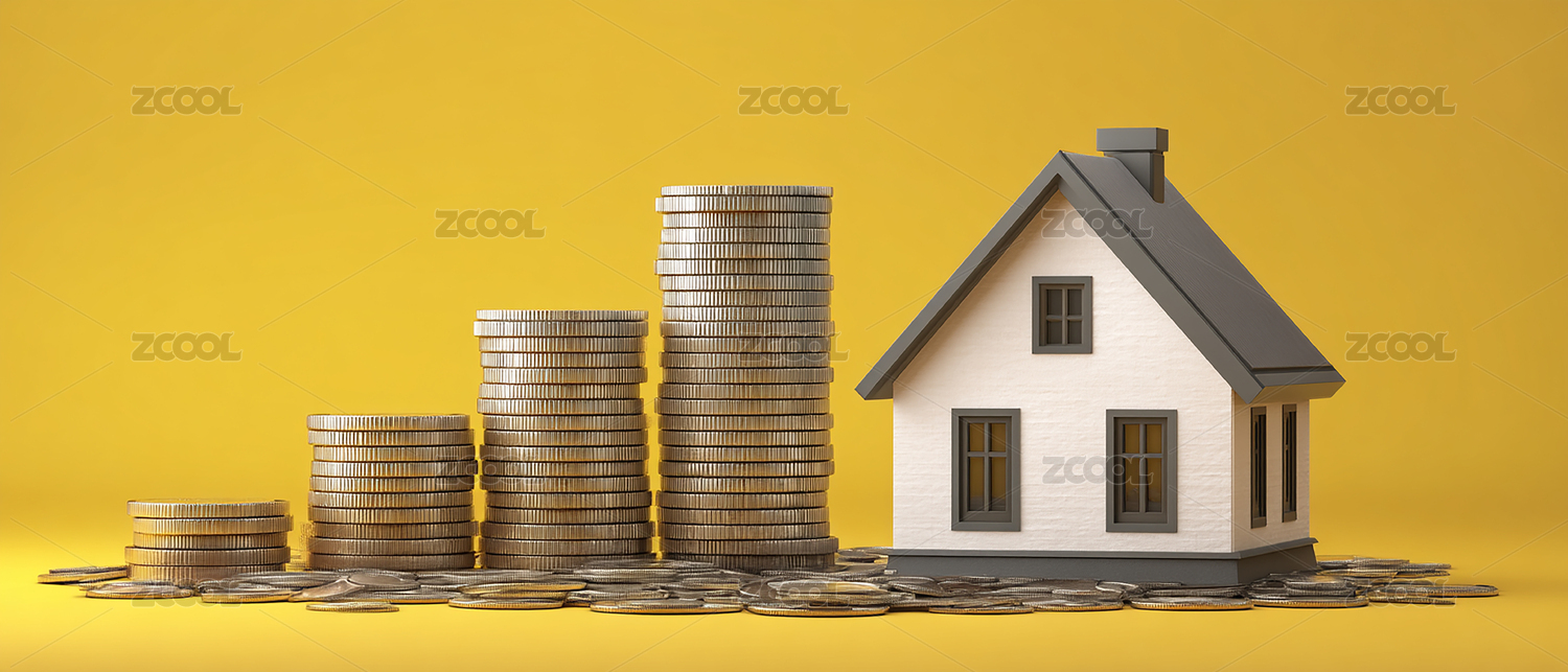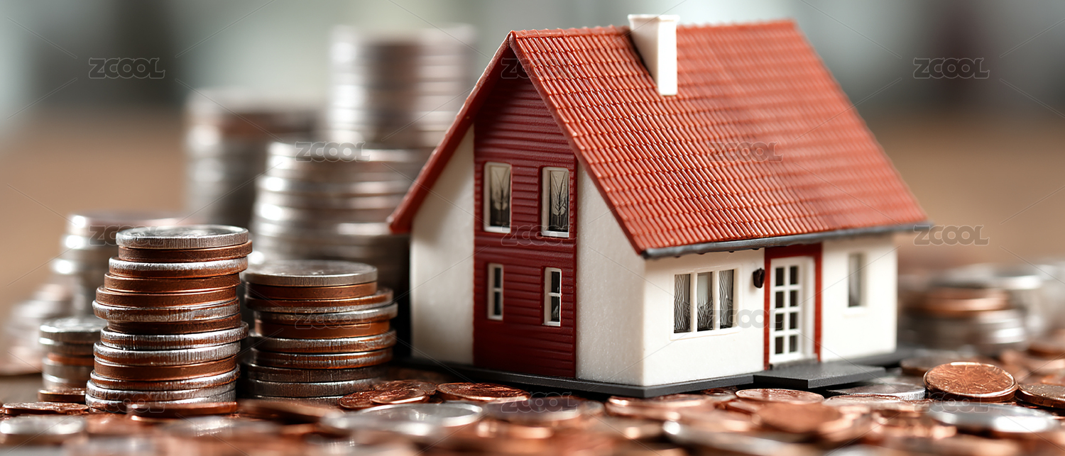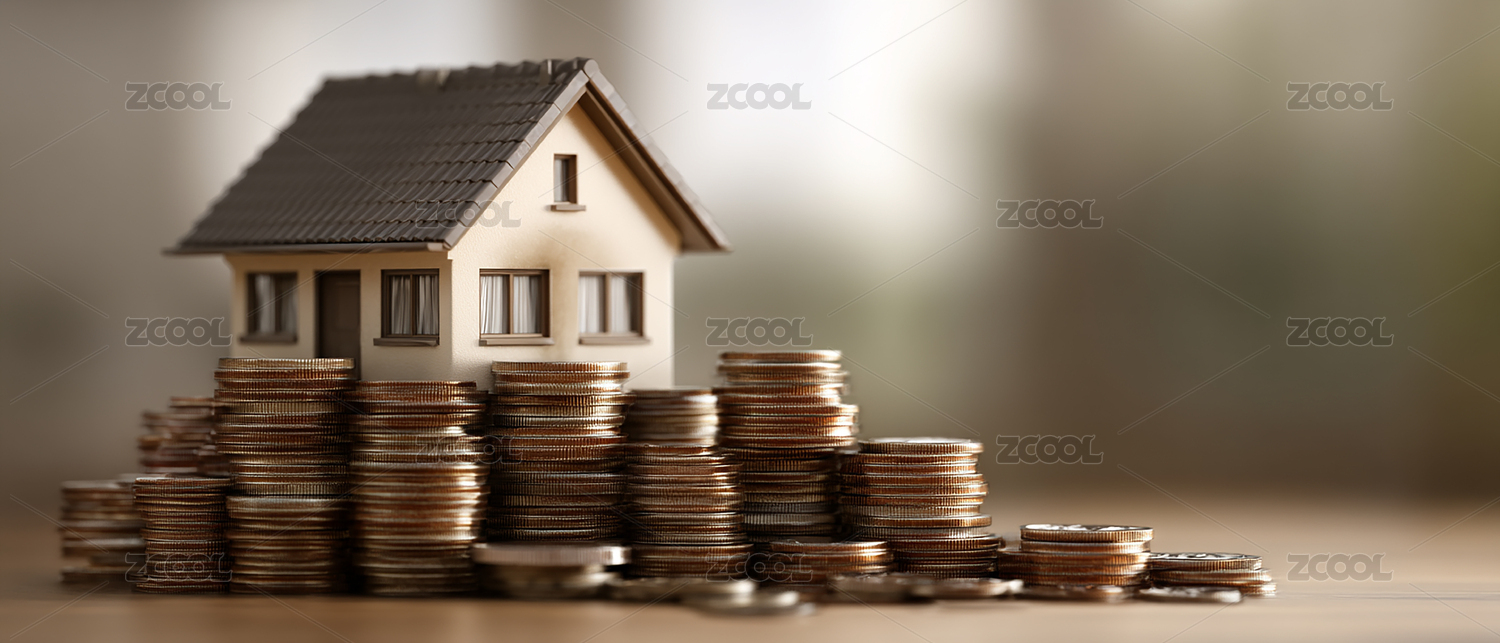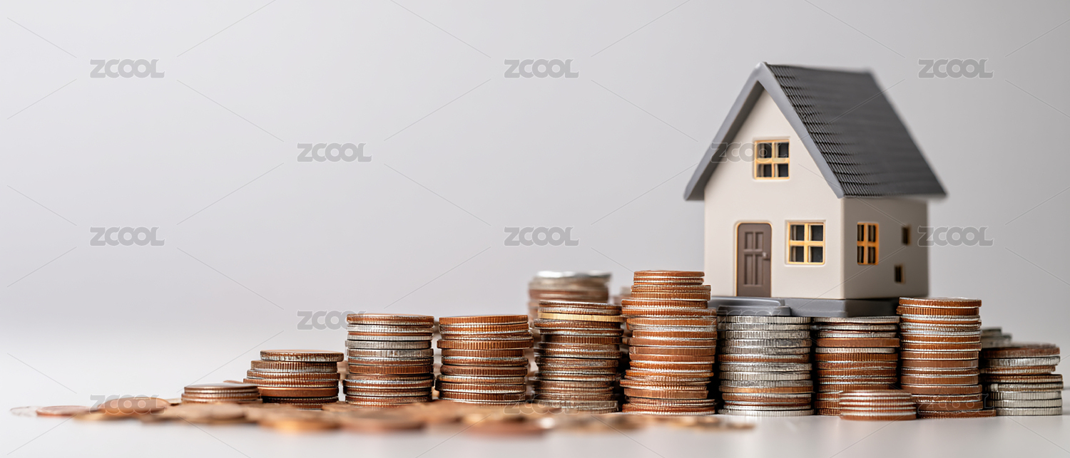 硬币堆上小房子模型的金融概念场景