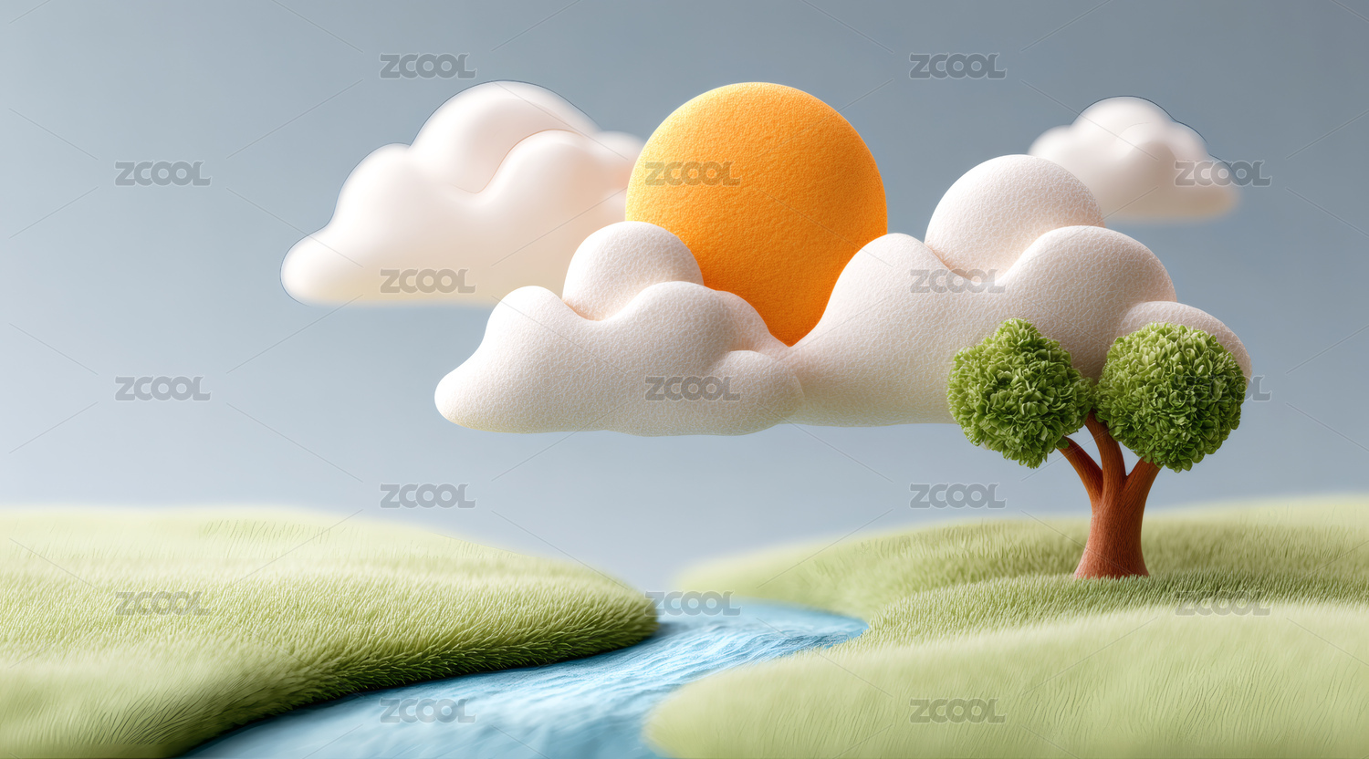 绿色羊毛毡毛绒毛线田野3D卡通立体插画