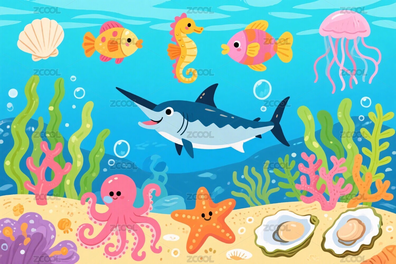 鲨鱼,小鱼,珊瑚,海底,插画,海洋,卡通,动物,气泡,植物