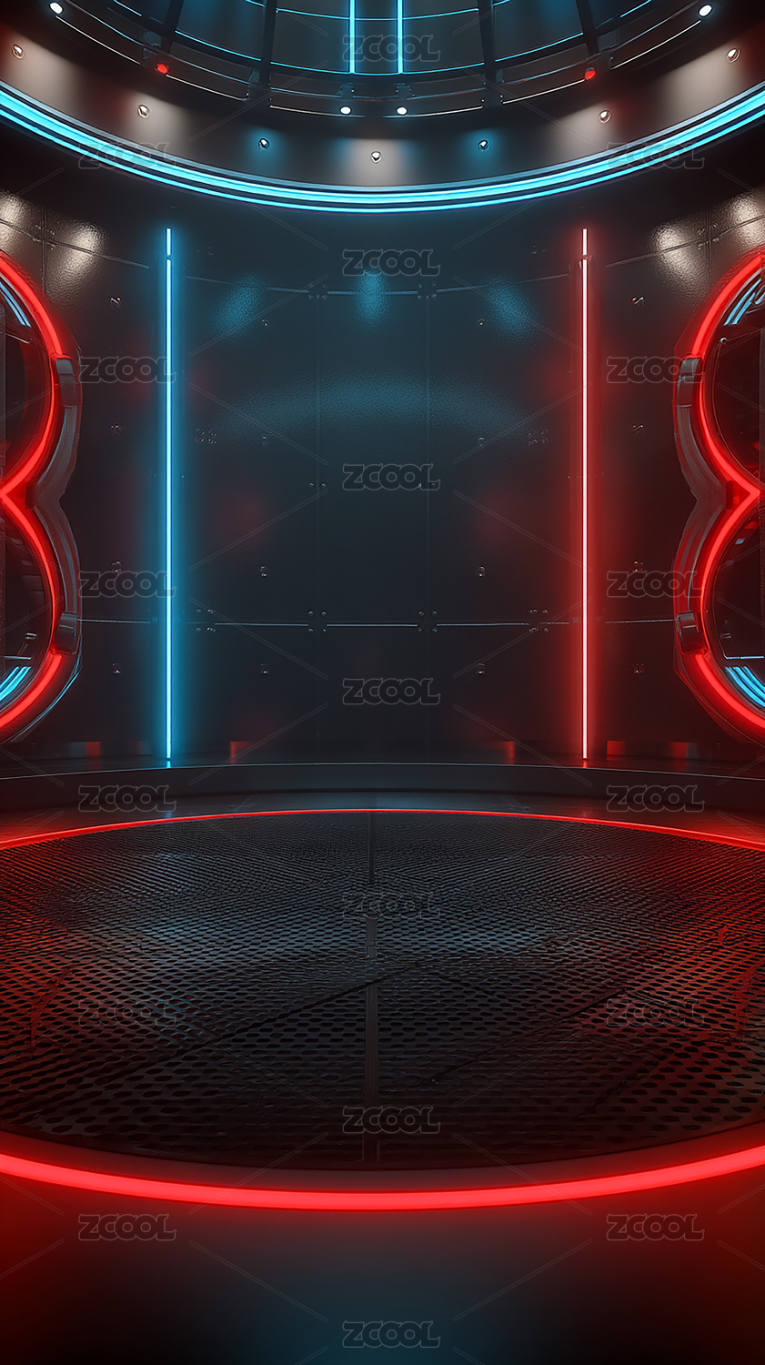 赛博,朋克,霓虹,科技,空间,未来,环形,灯光,展厅,红蓝