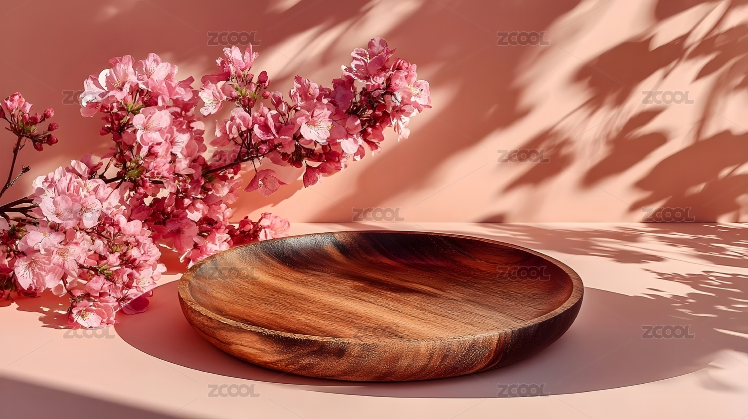 木盘与粉色花朵静物组合