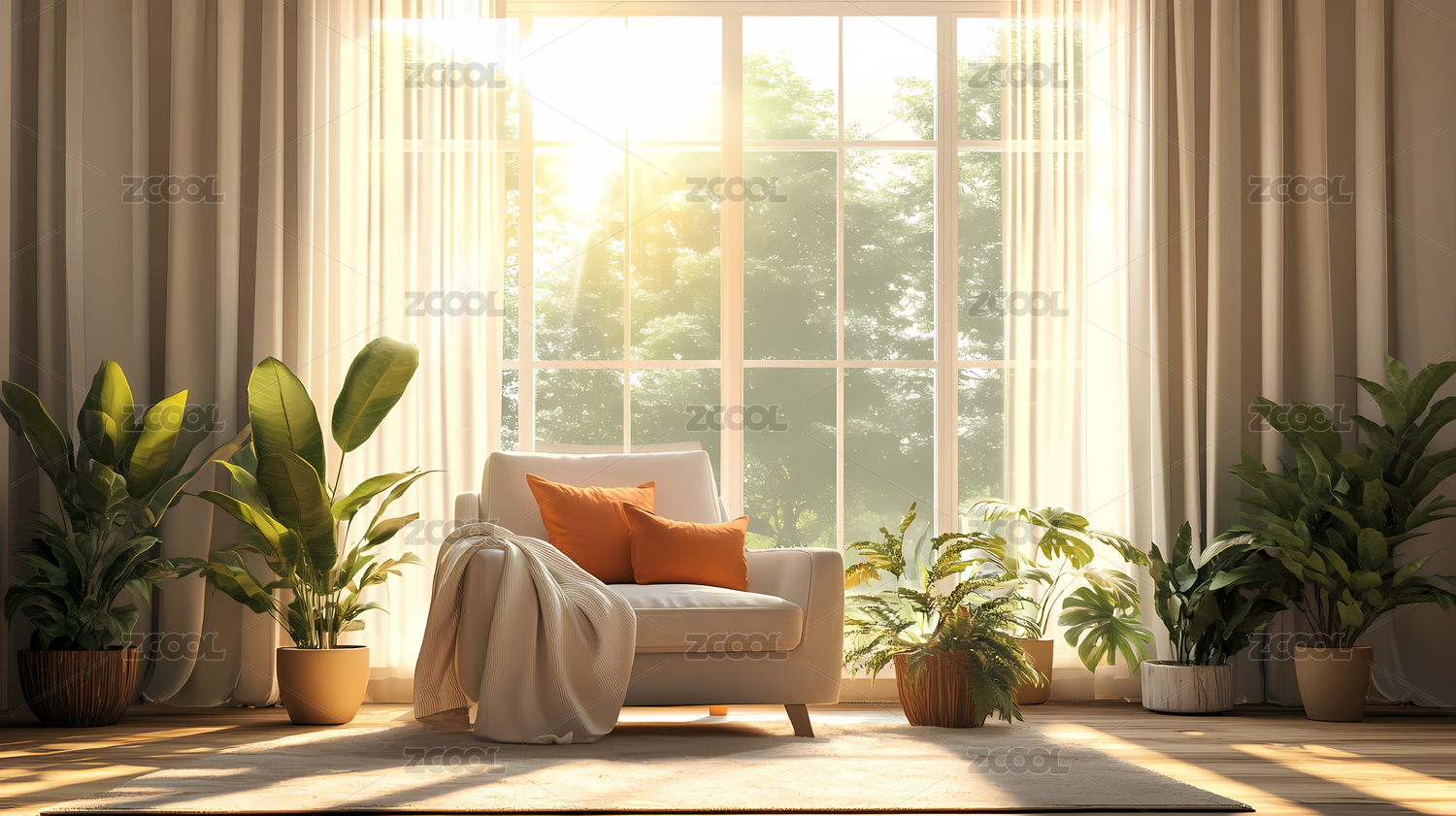 阳光洒满的室内绿植与橙色扶手椅